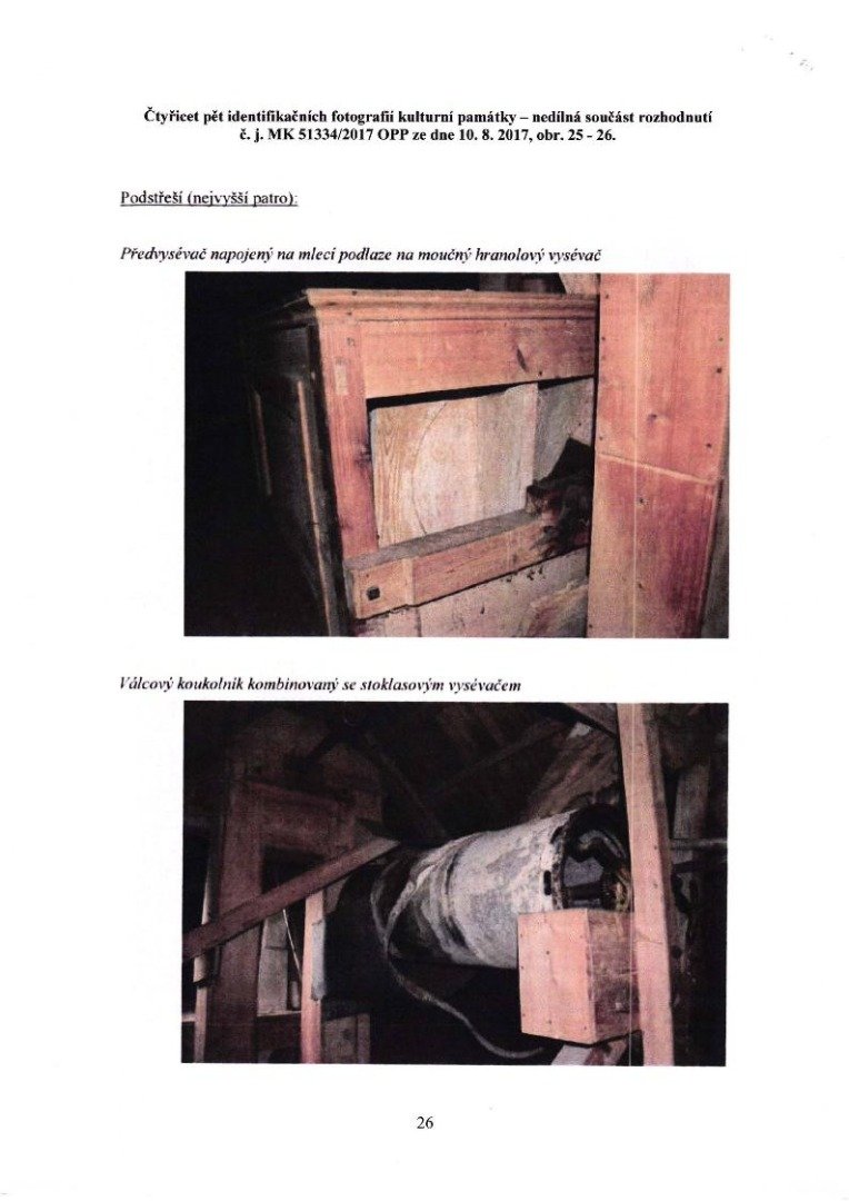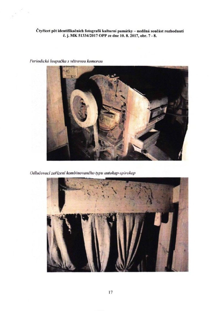 V čistírenské části „hruďák" (tedy krátký čistírenský hranolový vysévač) od firmy Leopold Kašpar, válcový koukolník [„trieur"] o rozměrech 40 x 150 cm a „loupačka elka č. 2 “ od firmy Leopold Kašpar.