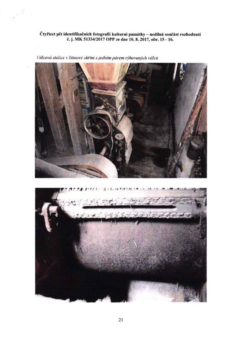 válcová stolice v litinové skříni s jedním párem rýhovaných válců (dle Dotazníku k přihlášení do Mlynářského ústředí se jedná o válcovou mlecí stolici Josef Prokop Pardubice, ale její charakter odpovídá výrobku Julius Hübner & Karl Opitz Pardubice - viz Rodinov čp. 33 - PE, Městská Habrová čp. 734 - RK); plochý řemen, který přenášel pohon z transmise k ní, kryje řemeslně vyrobený dřevěný kryt, jehož zaoblená část nad řemenicí je vytvořena jako polygonální se zářezy na vnitřní straně
