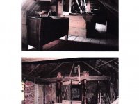 transmisní hřídel s dřevěnými řemenicemi (zavěšená pod stropem, z ní se plochýmiřemeny poháněly stroje v podstřeší