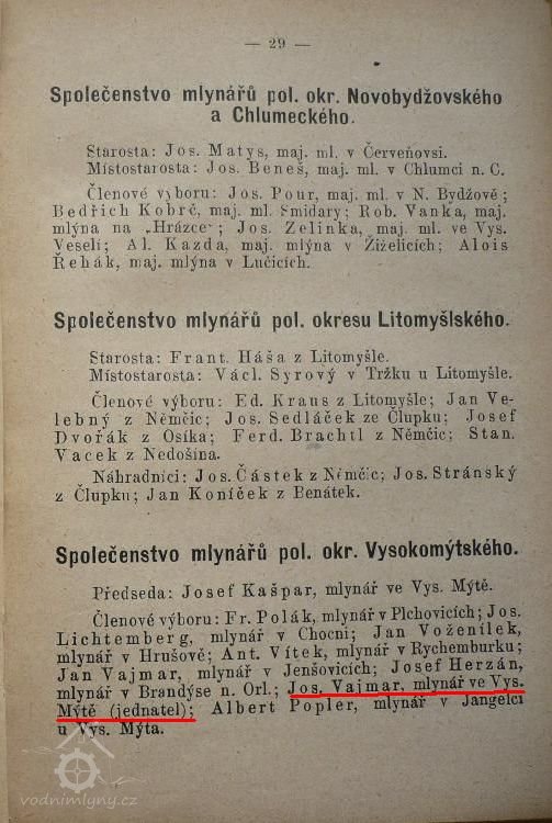 1899 - Jos. Vajmar jednatelem Společenstva mlynářů okr. Vysokomýtského (Fr. Duška, Kapesní kalendář mlýnů česko-moravských, r. 1899) (HŠ)