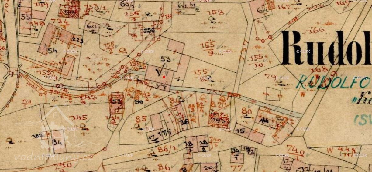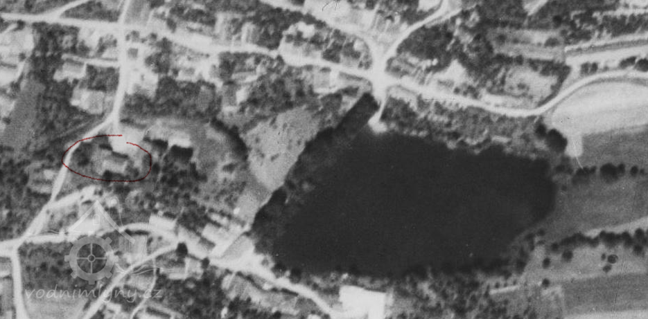 Rudolfovský mlýn, napájený z nedalekého Královského rybníka stokou - svrchní vodou.