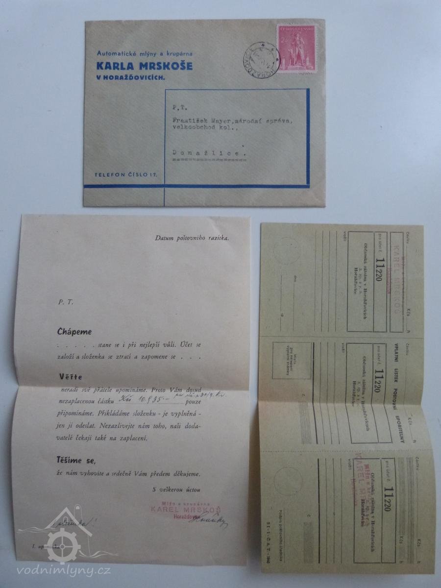 Několik dat z historie mlýna „MRSKOŠ“ v Horažďovicích. Mlýn Podmezský (nazývaný také Podměstský), později zvaný „MRSKOŠ“ vznikl podle prvních písemných zmínek v roce 1373 na pravém břehu řeky Otavy. Původním majitelem byla obec, postupem času byl mlýn obcí pronajímán a posléze také prodán. Roku 1855 kupuje mlýn rodina Mrskošova z Nového Knína a tím doslova a do skutku začíná rodinná mlynářská historie Mlýna MRSKOŠ. V roce 1910 Karel Mrskoš starší přestavěl nejen mlýnskou budovu, která byla zvýšena na tři patra, ale došlo i k modernizaci strojního zařízení ( fa Prokop Pardubice ). K pohonu mlýna byla postavena Francisova turbina s vlastní strojovnou, která využila síly a dravosti řeky Otavy.V roce 1914 nejen mlýn zastihla 1. světová válka, která ovšem nikterak neovlivnila provoz mlýna, ba naopak mlýn v těchto zlých časech zásoboval celé okolí moukou.V roce 1923 Karel Mrskoš starší umírá a mlýn přebírá jeho syn.V období 1932-1937 prožívá mlýn hospodářského rozmachu a je zřízena krupárna, která přináší mlýnu velký užitek, neboť na ječné kroupy je velký odbyt. Začíná se rovněž mlýt ječná mouka zn. „Perla“. Díky tomuto období dochází v roce 1935 k další strojní modernizaci opět firmou Prokop Pardubice. V roce 1936 kupuje mlýn první nákladní automobil zn. Škoda, kterým zajišťuje veškerou dopravu.V roce 1938 mlýn prochází další rekonstrukcí a modernizací . Nelehké období 2. světové války (1939-1945) přineslo mnoho strachu, starostí a útrap. Hned po začátku války byly zavedeny potravinové lístky na mouku, což způsobilo její prodávání mimo příděly, tento způsob prodeje byl označován jako „černý trh“. Zde nejen mlýn K. Mrskoše, ale všechny české mlýny sehrály důležitou úlohu v zásobování obyvatelstva. To samozřejmě vedlo k mnoha spekulacím s cenou mouky na „černém trhu“. Ke cti Mrskošova mlýna slouží skutečnost, že zde byla prodávána moukla za normální ceny. Toto černé mletí jakož i prodej mouky bylo stíháno a přísně trestáno. Po konci války v roce 1945 byl zakoupen další nákladní automobil zn. Opel. Ani tomuto mlýnu se nevyhnulo zestátnění a tak v roce 1948 byl mlýn znárodněn a začleněn pod správu n.p. Jihočeských mlýnů v Českých Budějovicích a následně roku 1950 přechází mlýn pod Západočeské mlýny. Díky moderní technologii a vysoké produkci si komunističtí vládci netroufli mlýn zavřít. V období socializmu byl Mrskošův mlýn částečně modernizován strojním zařízením, nově byla vystavěna budova balírny a administrativy. Pouze „elektrárnička“ (Francisova turbína ) neodolala smělým plánům socialismu a v roce 1965 byla při přestavbě jezu vyřazena z provozu a následně zasypána. V první vlně privatizace byl mlýn vrácen manželce (Boženě Mrskošové) a dceři (Marii Melzerové) původního majitele mlýna pana Karla Mrskoše, které ke dni 1.10.1991 tento mlýn převzali.Do té doby byl mlýn označován jako provoz mlýn Horažďovice a spadal pod s.p. Západočeské mlýny. Tímto datem začalo pět budov na rozloze skoro 4 ha na pravém břehu řeky Otavy v Horažďovicích , obrazně řečeno, psát svoji další kapitolu života. Pro správu restituovaného majetku byla zvolena forma podníkání OSVČ s názvem Marie Melzerová – Mlýn a krupárna MRSKOŠ. Tímto datem začala další rekostrukce a modernizace budov a nového strojního zařízení. Od roku 1991, kdy byl horažďovický mlýn navrácen původním majitelům, vložila rodina nemalé finanční prostředky do úpravy budov a nového strojního zařízení. V roce 2002 byla založena společnost s ručením omezeným, která převzala využívání nemovitostí a všechny obchodní aktivity dosavadního modelu podnikání fyzické osoby Marie Melzerové.