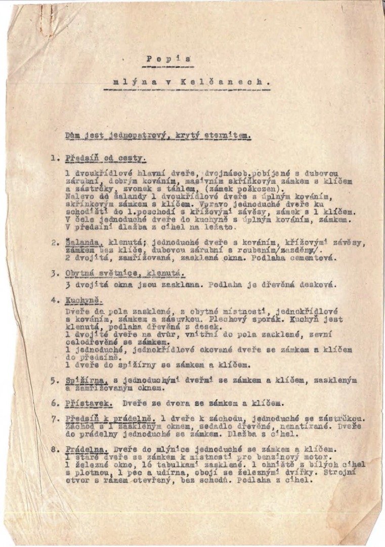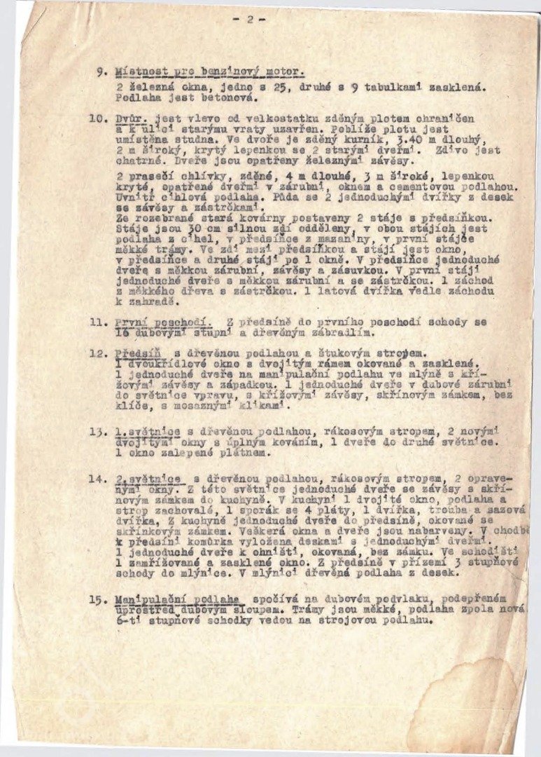 Někdy v r. 1987-8 (byli jsme se tam podívat) byla budova již pustá, volně přístupná. V budově byly zdevastované zbytky technologií. Mlýnské kolo bylo do úrovně terénu zasypáno sutí a smetím, nad terénem bylo ale skoro kompletní nicméně ztrouchnivělé. (Petr Zůbek)