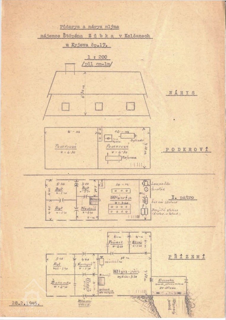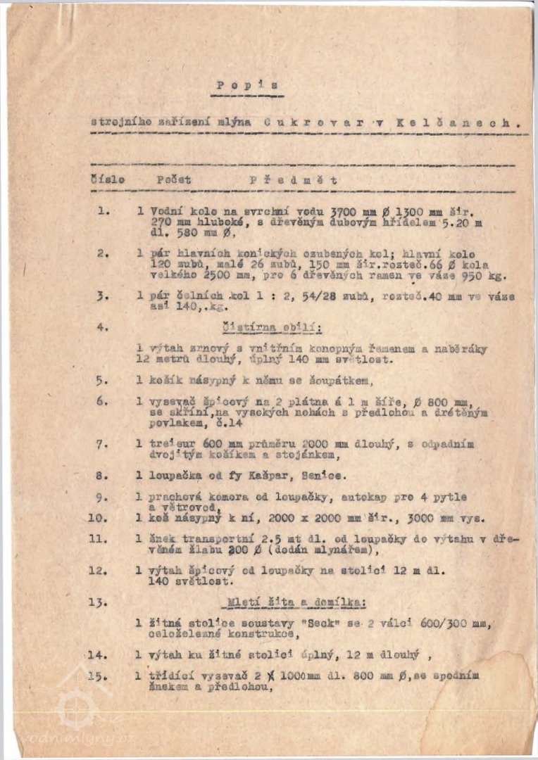 PopisV r. 1930 2 kola na svrchní vodu, průtok 127 resp. 84 l/s, spád obou 4.8m, výkon (celkový) 8.8 k.s.