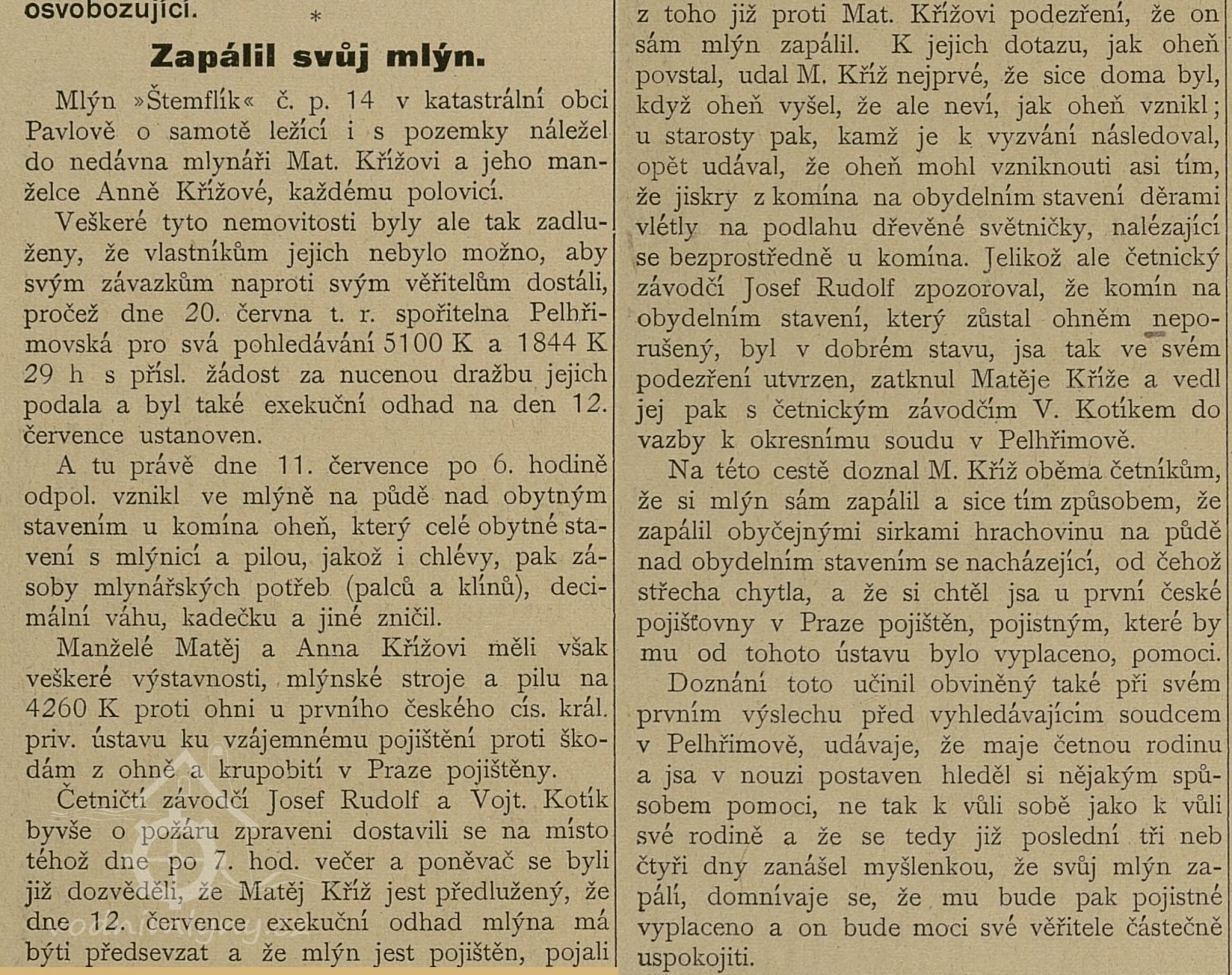 V roce 1905 mlýn vlastní Matěj Kříž společně se svou manželkou Annou, každý jednou polovinou. Celé hospodářství bylo natolik zadlužené, že nebylo možné uspokojit věřitele, proto 20.6. 1905 podala spořitelna Pelhřimovská žádost na nucenou dražbu mlýna. Aby se tomu M. Kříž vyhnul svůj mlýn 11.7. zapálil, jelikož se domníval, že následně získané peníze z pojistky mlýna ve výši 4260 K, alespoň částečně uspokojí věřitele. Při požáru, který začal na půdě u komína byla zničeno celé obytné stavení i s mlýnicí, pilou, chlévy a zásobami mlynářských potřeb. M. Kříž nejprve vinu popíral, později však doznal, že na půdě obytného stavení zapálil suchou hrachovinu od které pak vzplála střecha.