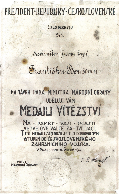 Budoucí mlynář František Bouše narukoval s 11. píseckým plukem na srbskou frontu, 12.12.1914 se u Stepajoviče nechal dobrovolně zajmout, zpočátku byl zaměstnán jako dělník u srbského mlynáře, po ústupu Srbů v roce 1915 se po nesmírně obtížné anabázi dostal do albánské Valony, kde byl naloděn a převezen do Itálie na ostrov Asinaru, odkud se 1916 dostal do francouzského Toulonu a byl internován v zajateckém táboře v Kaprianu, poté sloužil jako železniční zřízenec v Marseille. 1917 vstoupil do francouzských legií, nejprve k 7. rotě 21. pluku, poté byl převelen k 11. rotě 22. dragounského pluku, s nímž se účastnil všech bojů, za což dostal tři vojenská vyznamenání.
