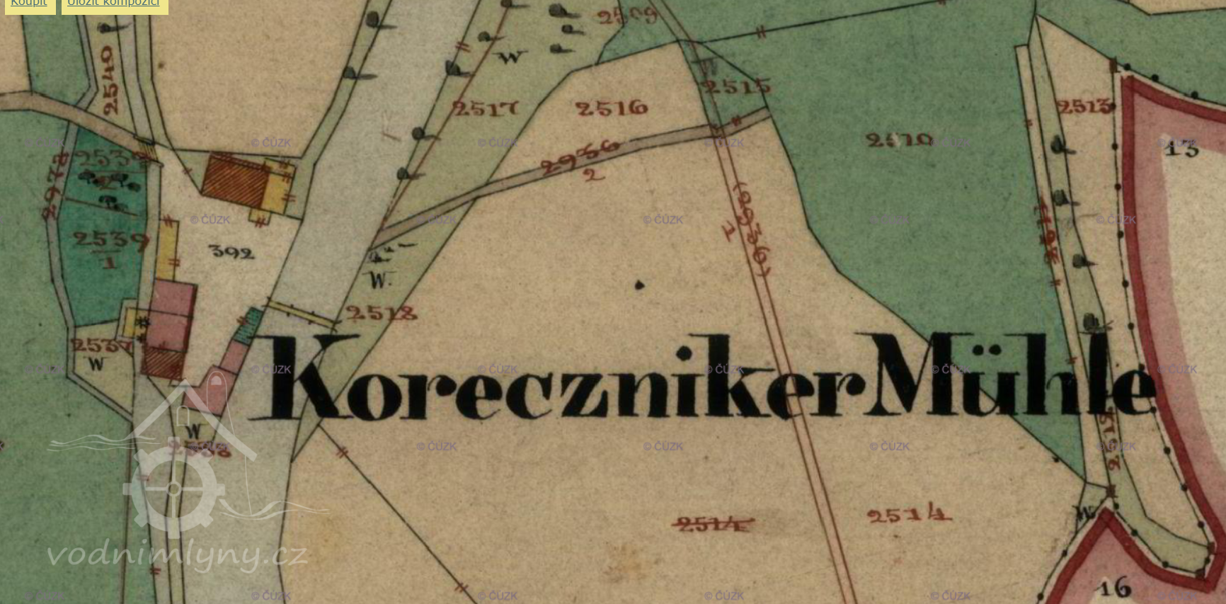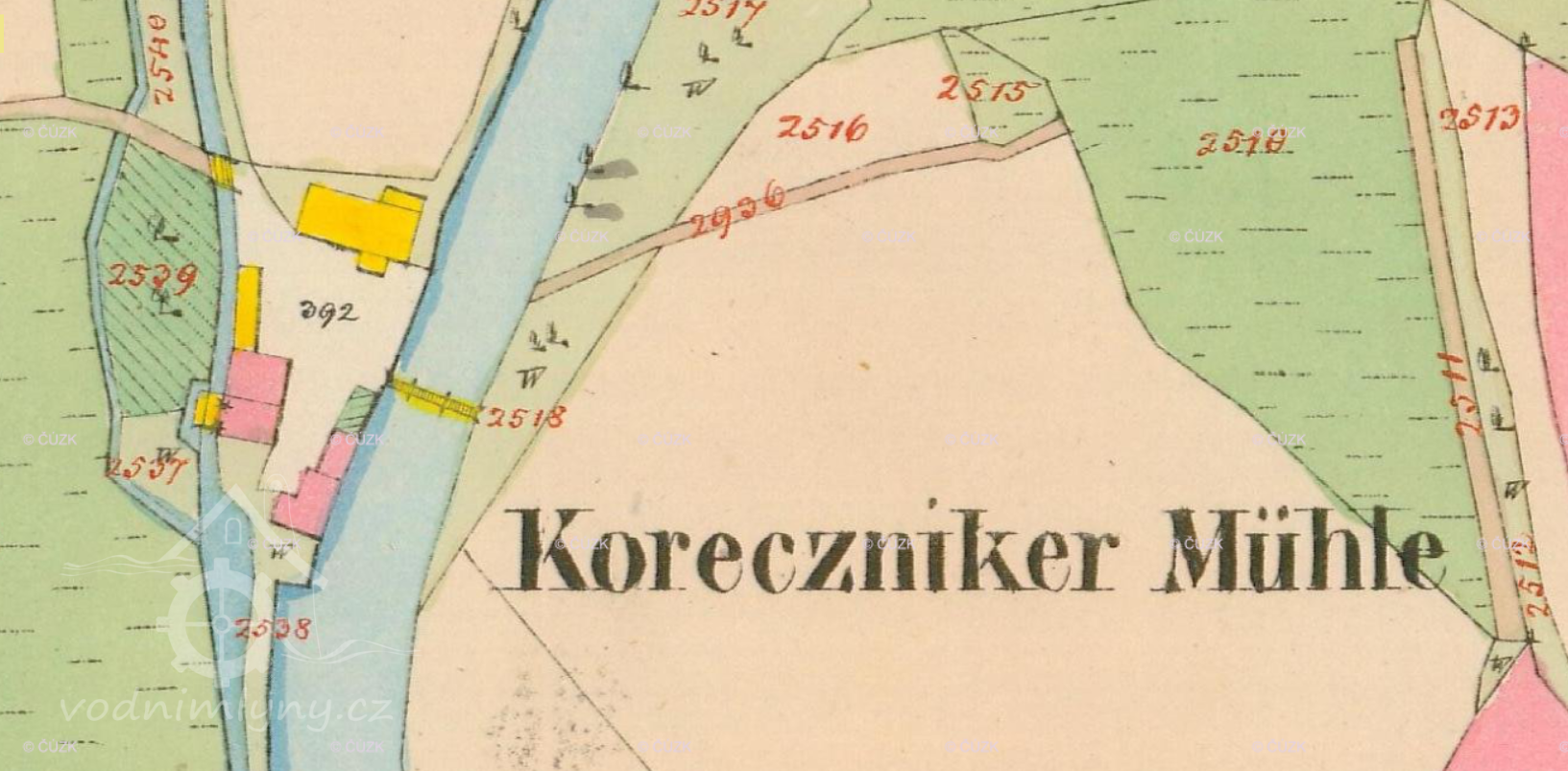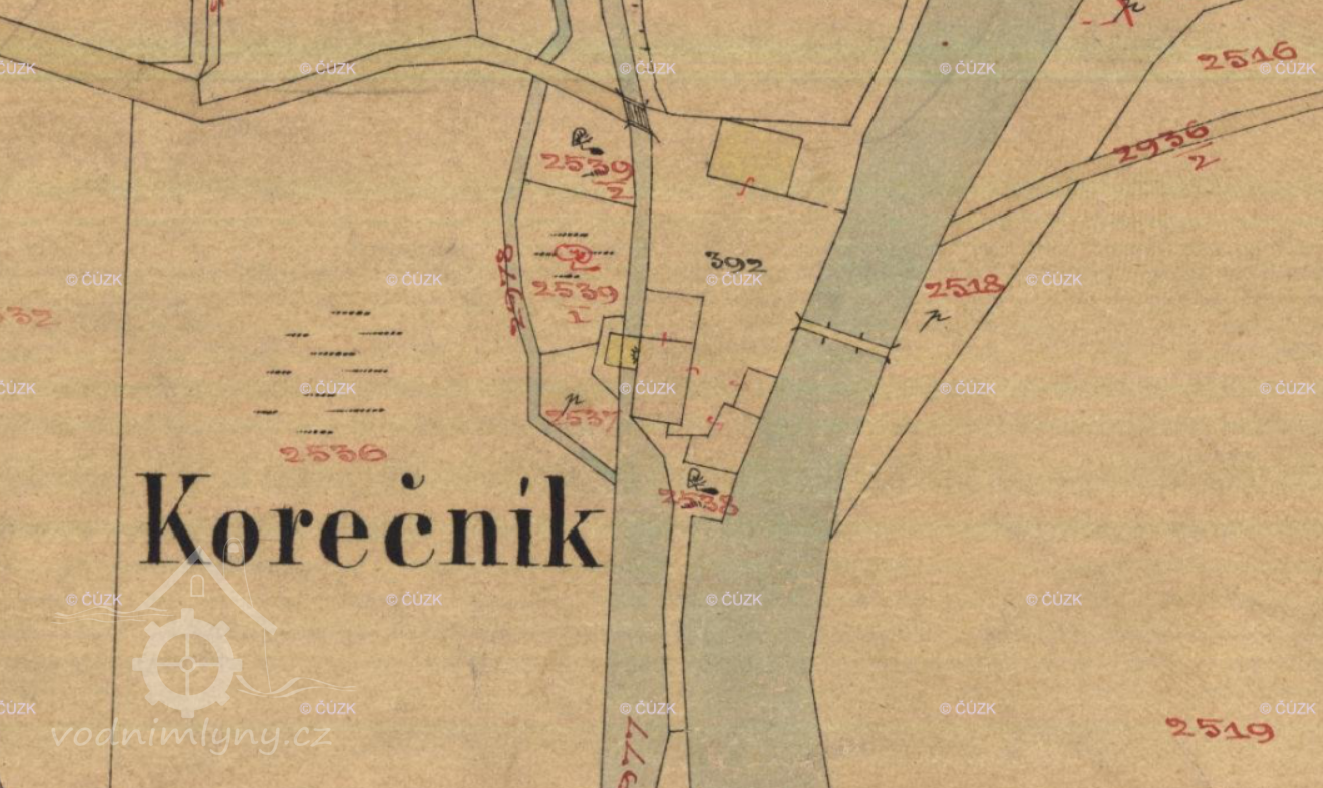 Soustavu původních mlýnů a hutí v údolí Padrťského potoka doplňoval o něco proti proudu mlýn Korečník čp.104/II. Jméno „Korečník“ se připomíná už v 16.století. Podle majitelů ve 20.století nazýván i „Pražákův mlýn“.