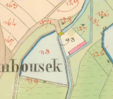 Nad mlýnem měnší rybník Bambousek z rybníka pevně zaklíněné otevřené stavidlo o šířce 1,91 m od stavidla šly vantroky