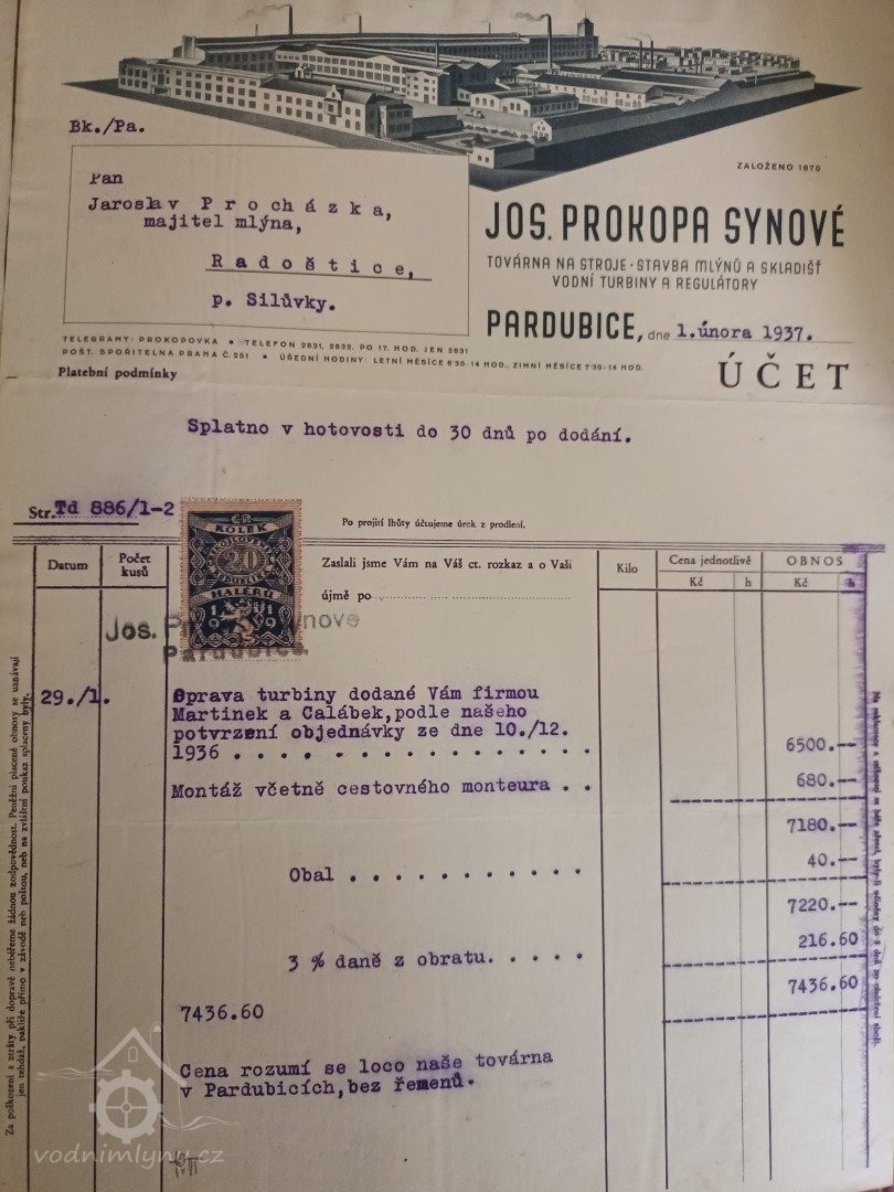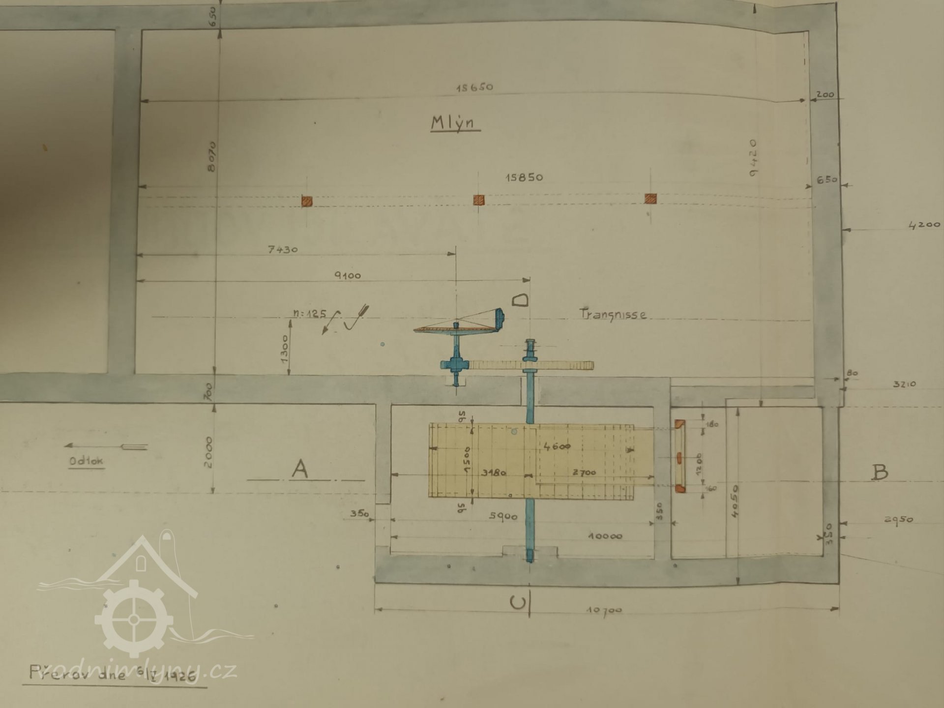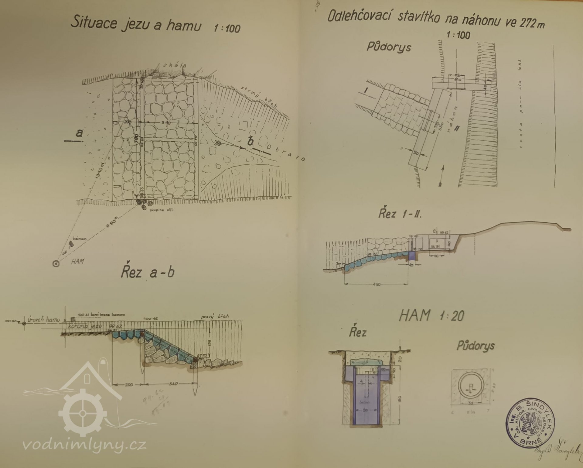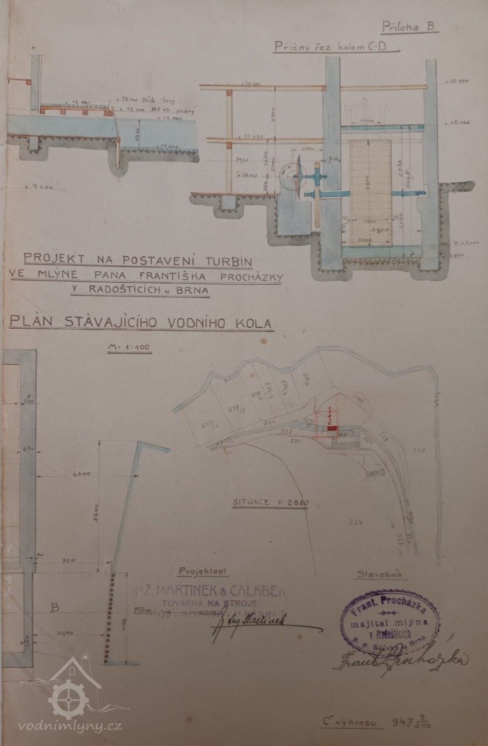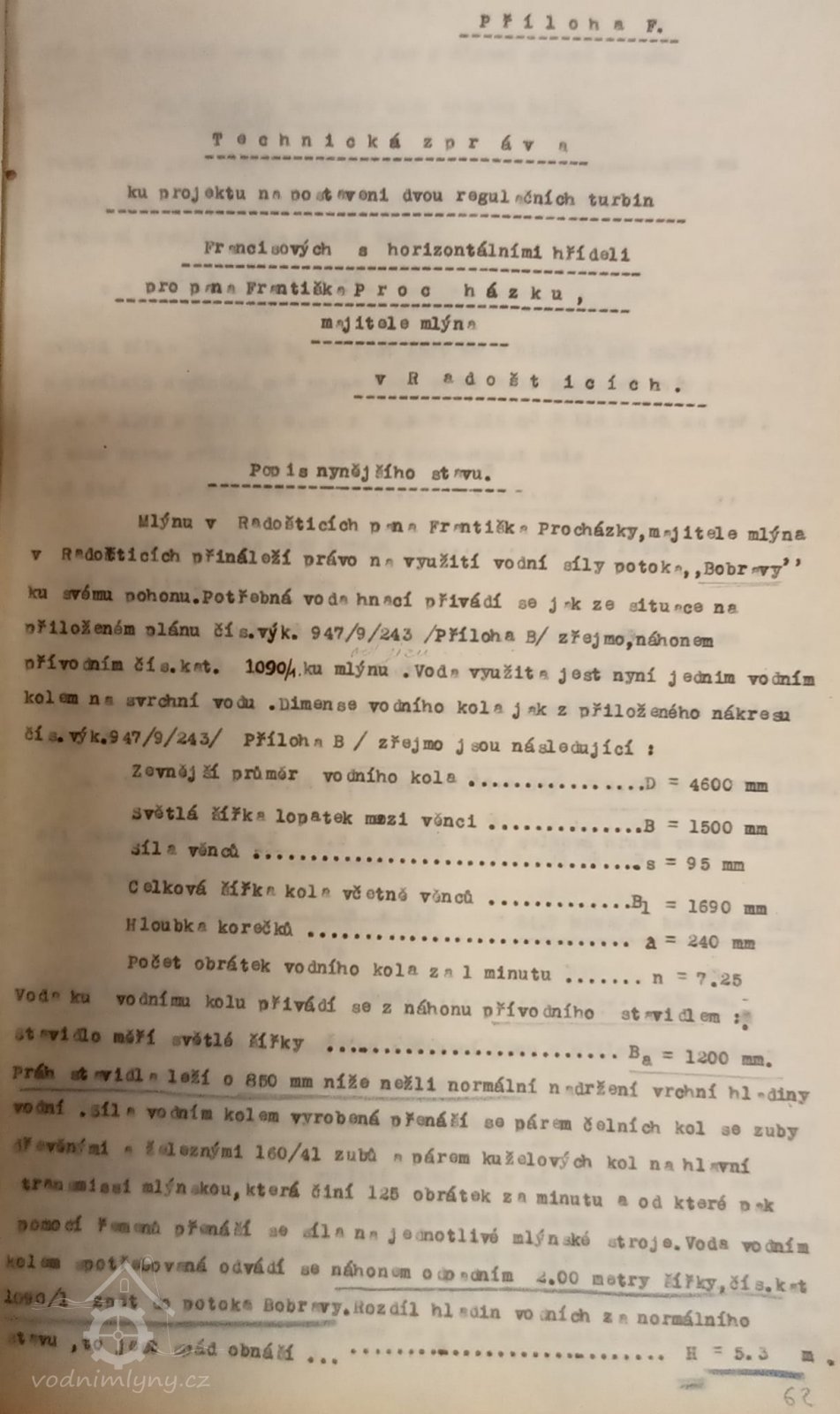 1. hltnost 0,18 m3/s, spád 5,25 m, výkon 10 HP,