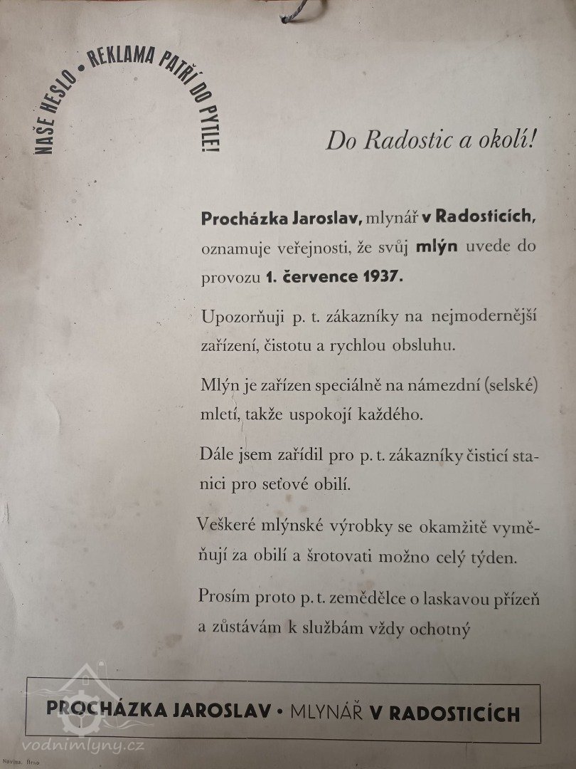 Za války mlynář tajně mlel pro Radostice, sebralo ho Gestapo, před zastřelením jej zachránilo to, že velitel Gestapa byl jeho spolužák ze školy (obce zde byly z velké části německé).