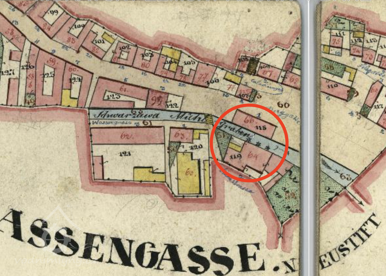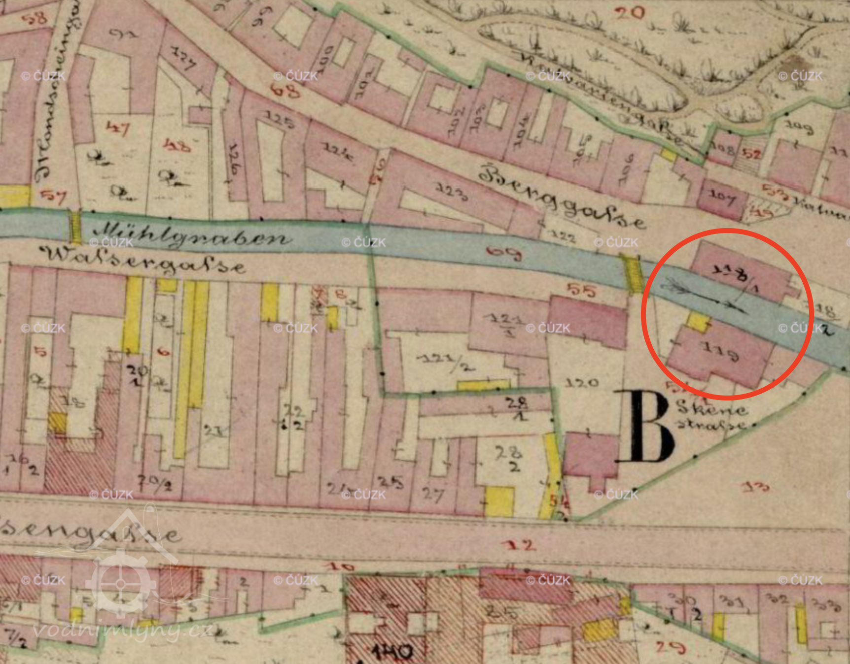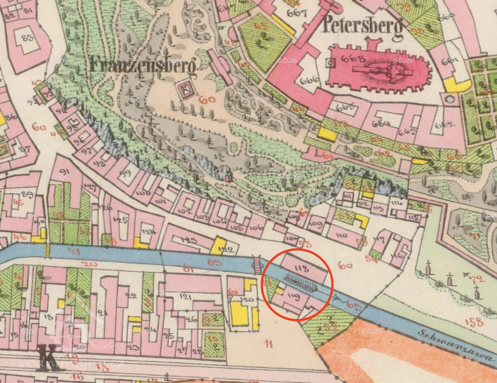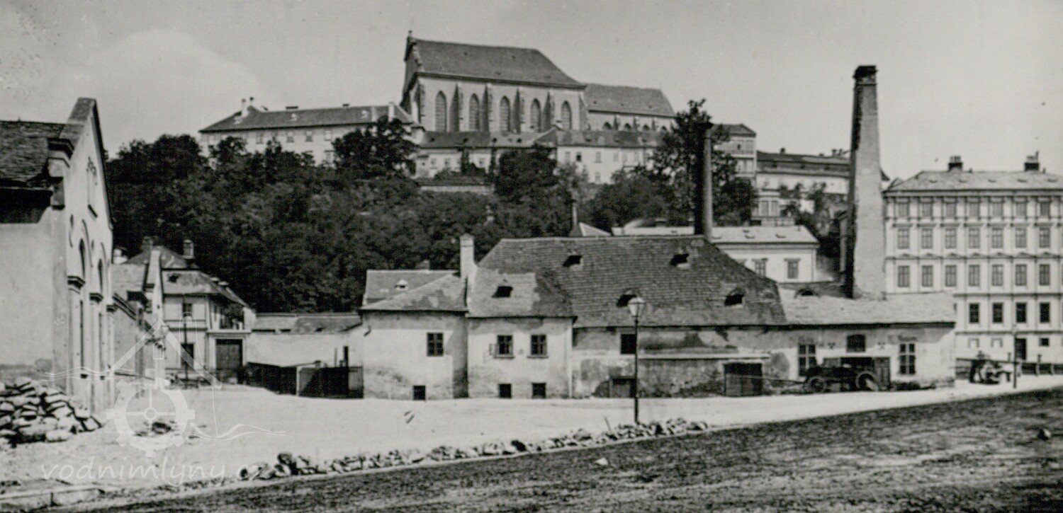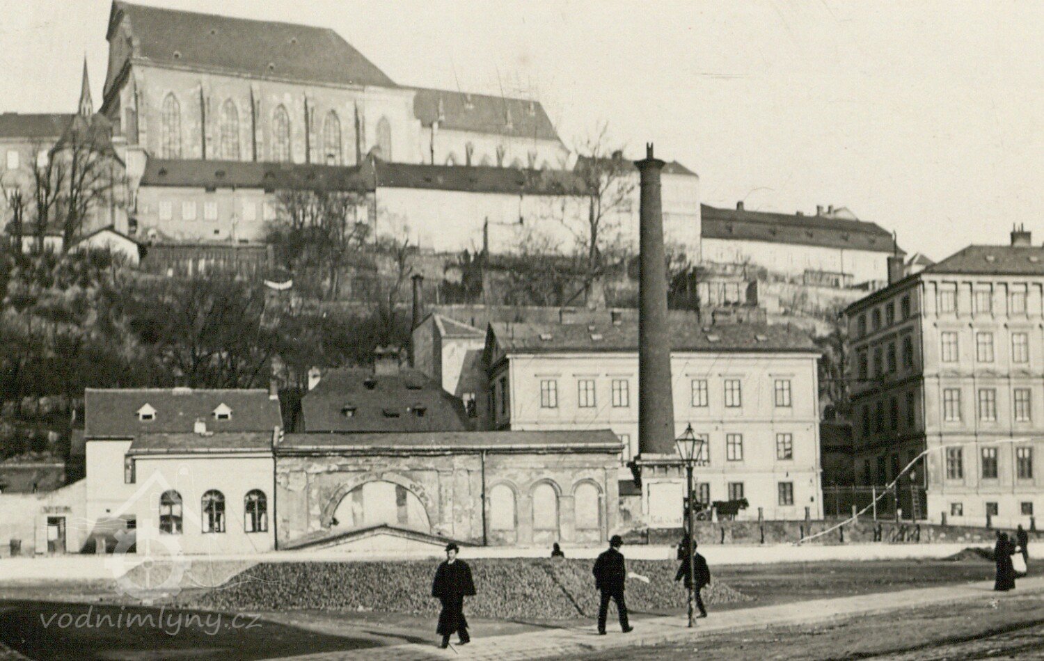 Lamplův mlýn stál na místě dnešních lázní na Kopečné ulici jistě již v 14. století, první dochovaná zmínka o něm je z roku 1351. Podle ní jistý mlýn stojí “sub monte dicto Purzpuhil”, tedy pod Puhlíkem (dnešní Denisovy sady). Roku 1355 tento mlýn koupil Ditlin Mauricus ze zámožné rodiny Mauriciusů. Počátkem 15. století byl majitelem tohoto mlýna bohatý brněnský mlynář Václav Ház. Ten roku 1416 s pomocí mistra Prokopa Peyska z Kutné Hory vybudoval první městský vodovod. Voda byla přivedena kamenným potrubím k mlýnu, kde byla na protějším (levém) břehu Svrateckého náhonu postavena vodárna s čerpadlem hnaným vodním kolem.