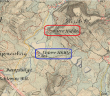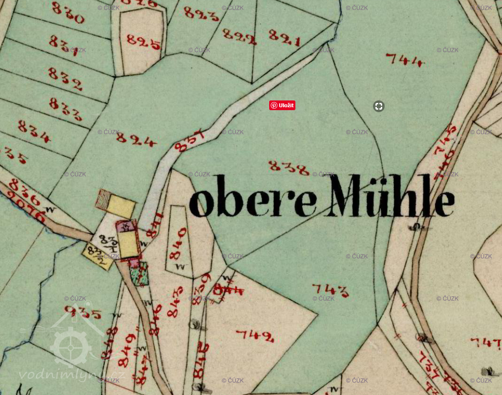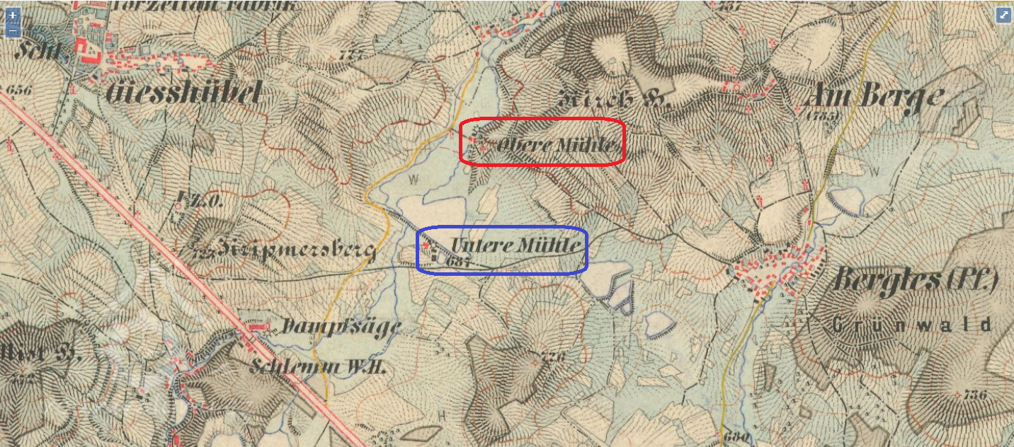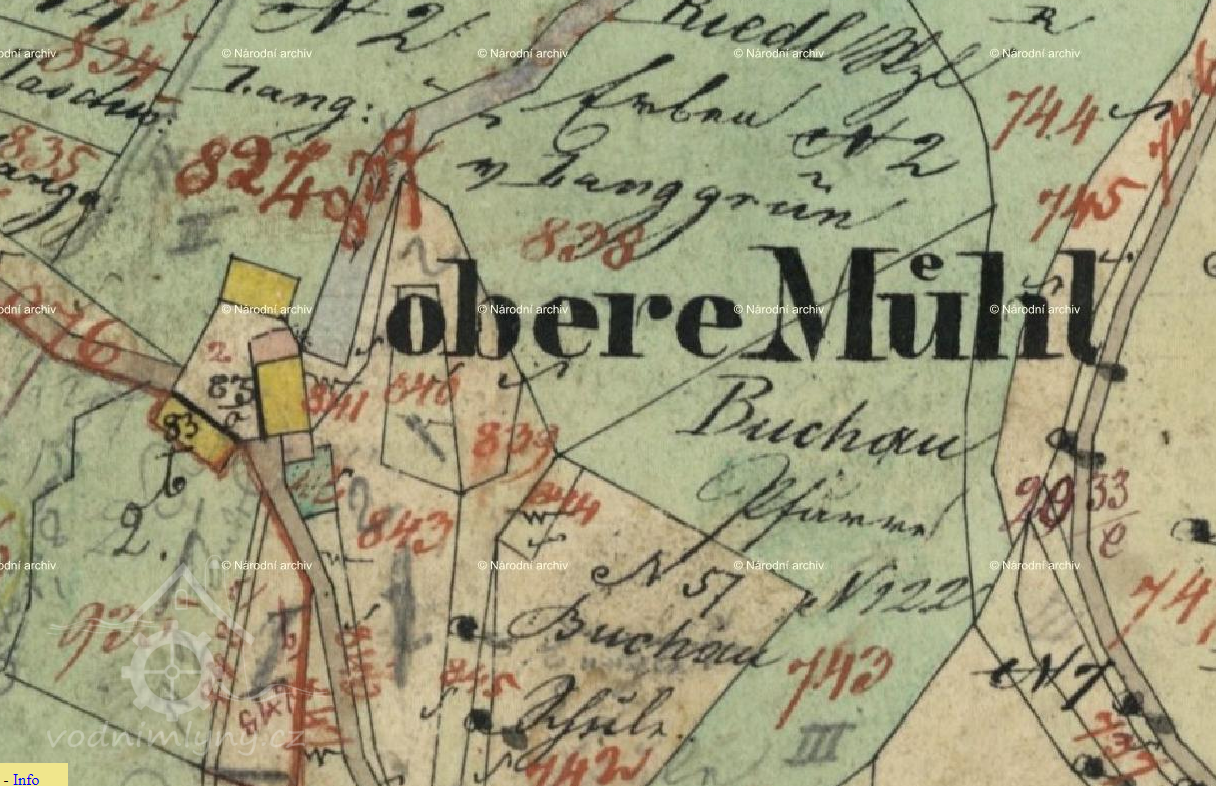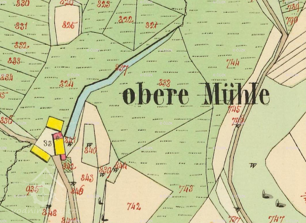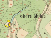 Horní mlýn je prvně zachycen na mapě 1. vojenského josefského mapování z let 1764-1768.