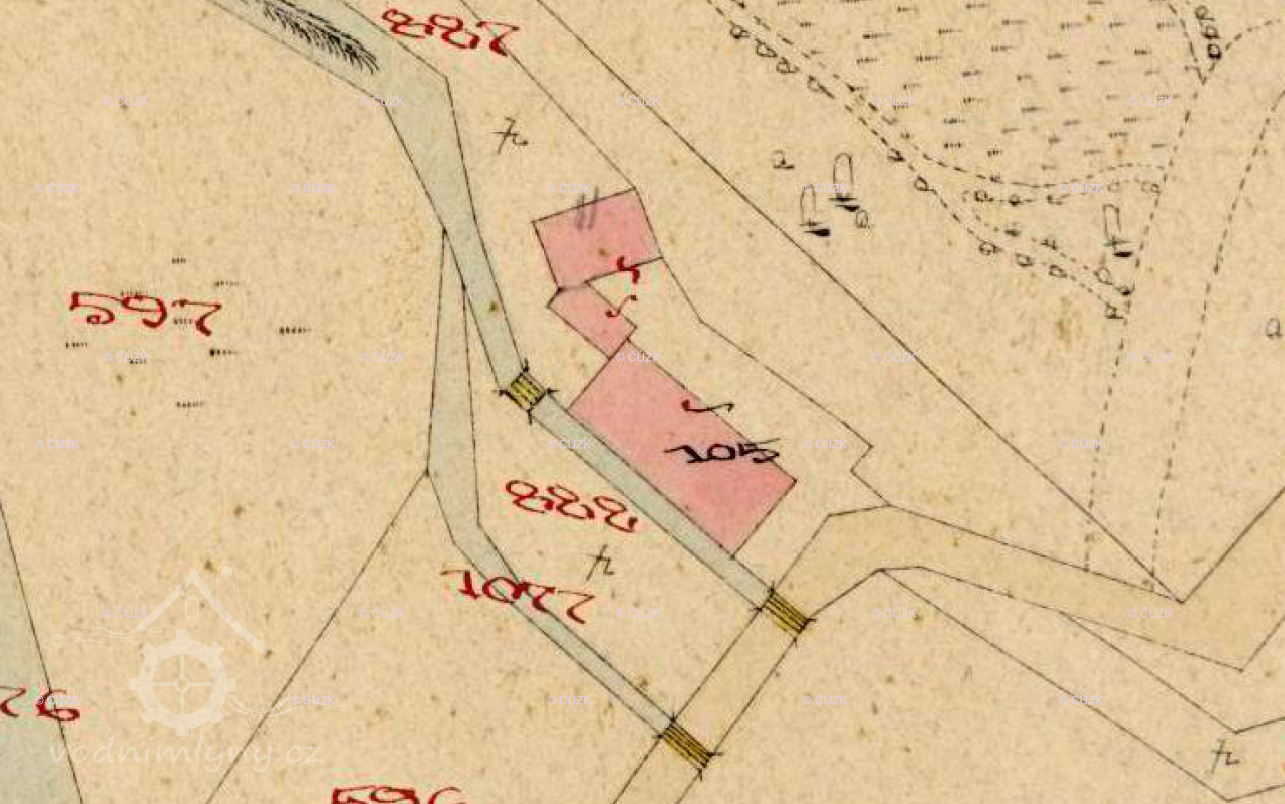 Babousek (červeně) a Panský mlýn (modře) ve Šťáhlavech, II. vojenské mapování. výřez, 1836-1852, © mapy.cz