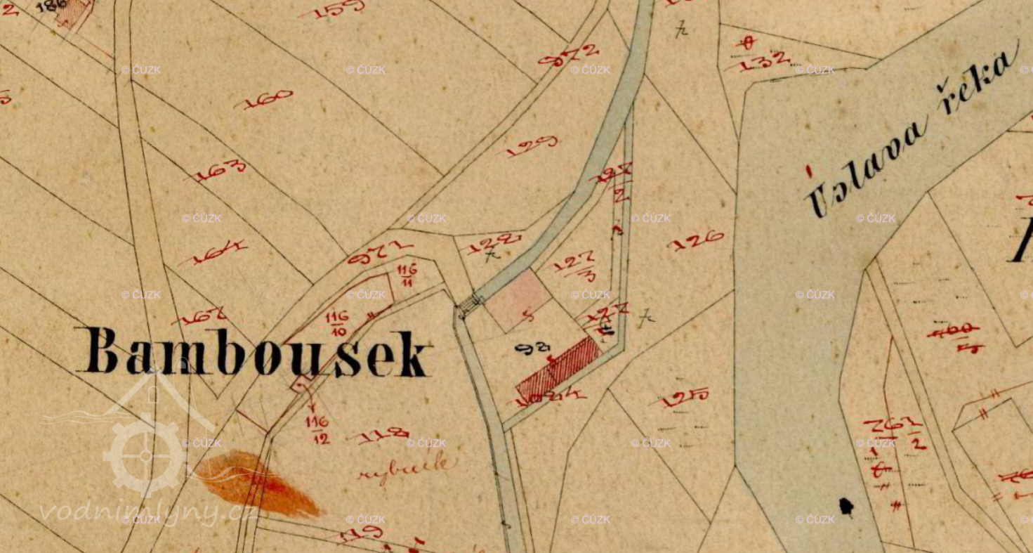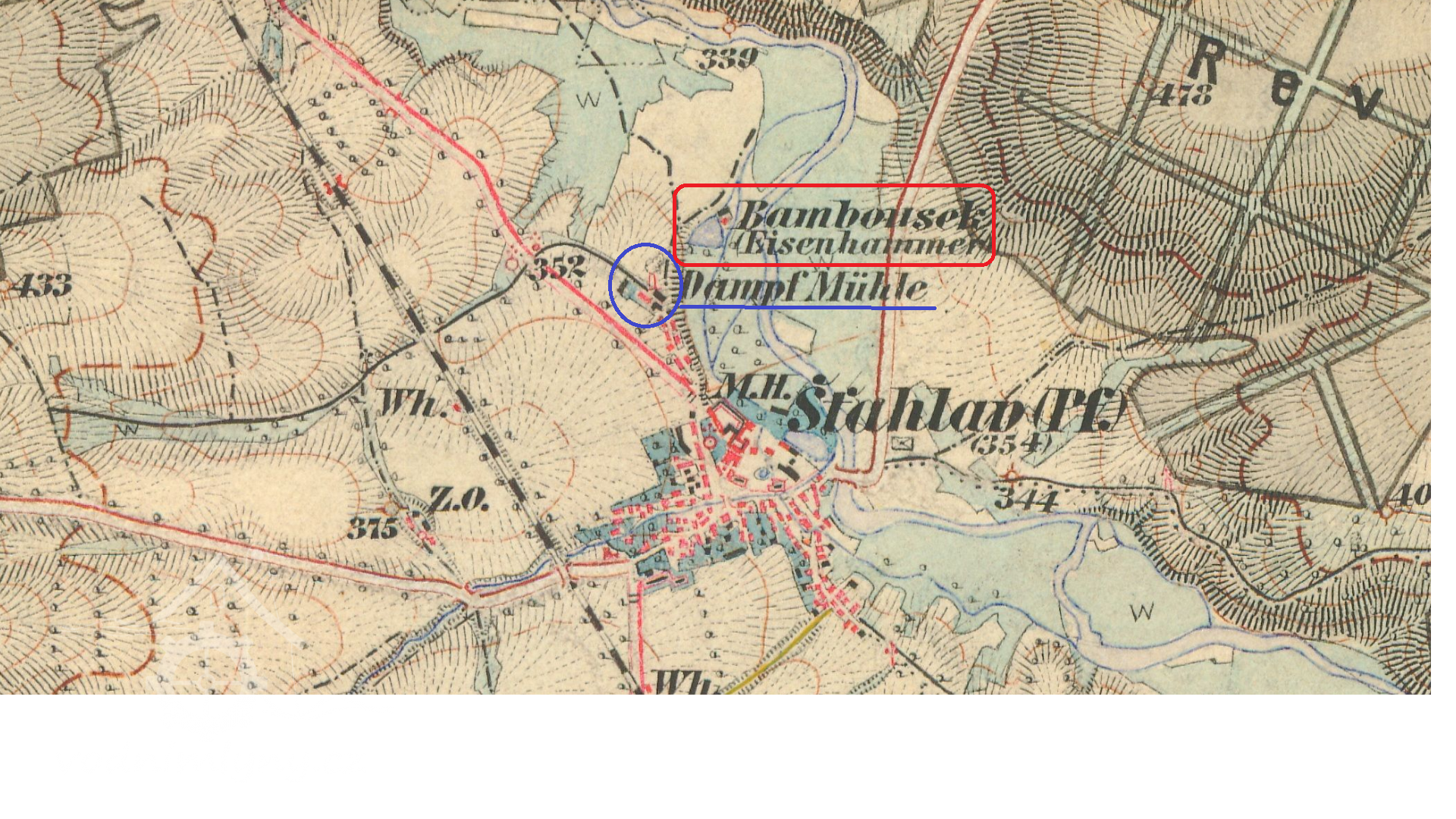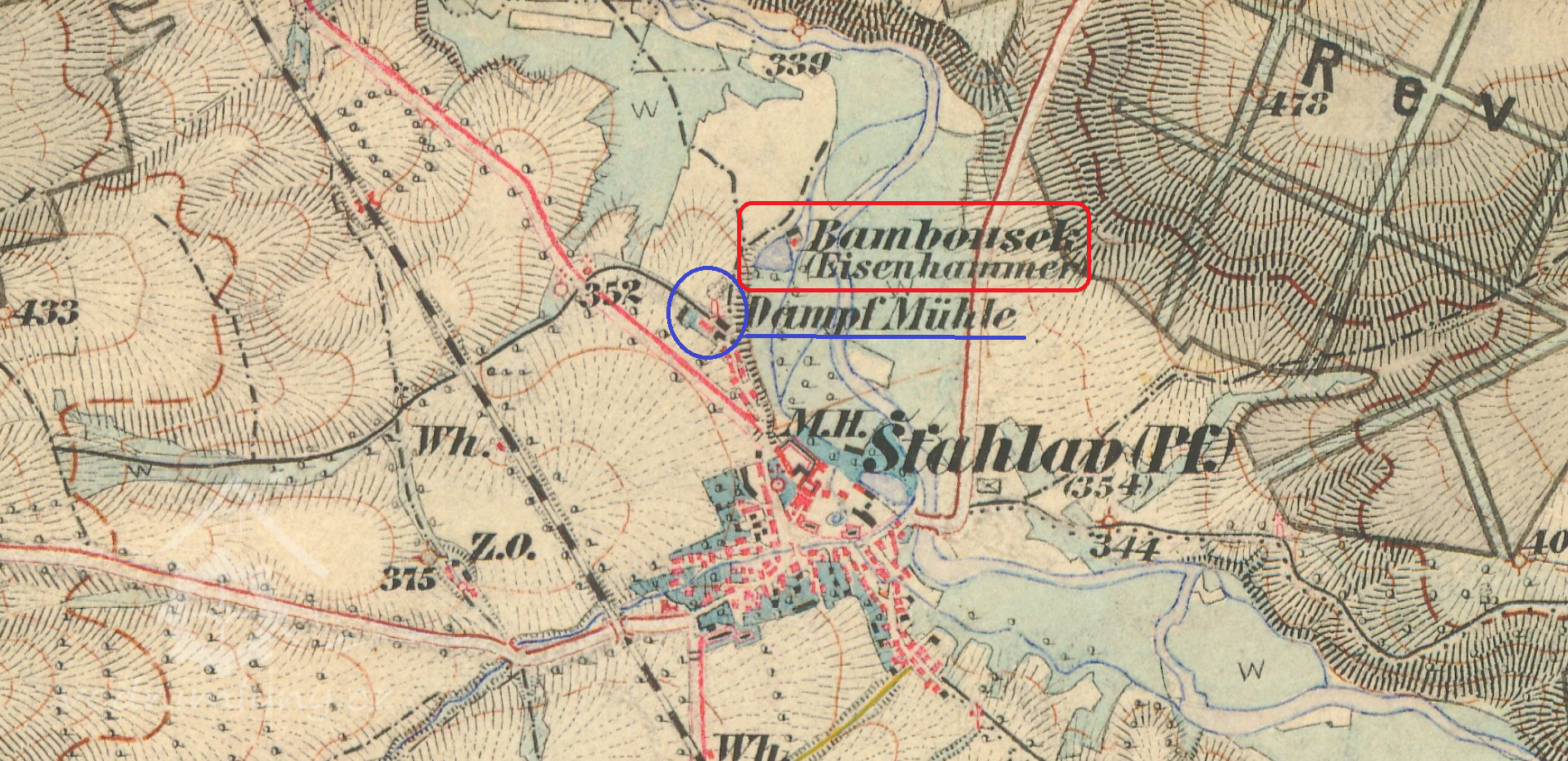 Bambousek (červeně) a Parní mlýn (modře) ve Šťáhlavech, III. vojenské mapování. výřez, 1877-1880, © oldmaps.geolab.cz