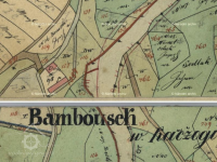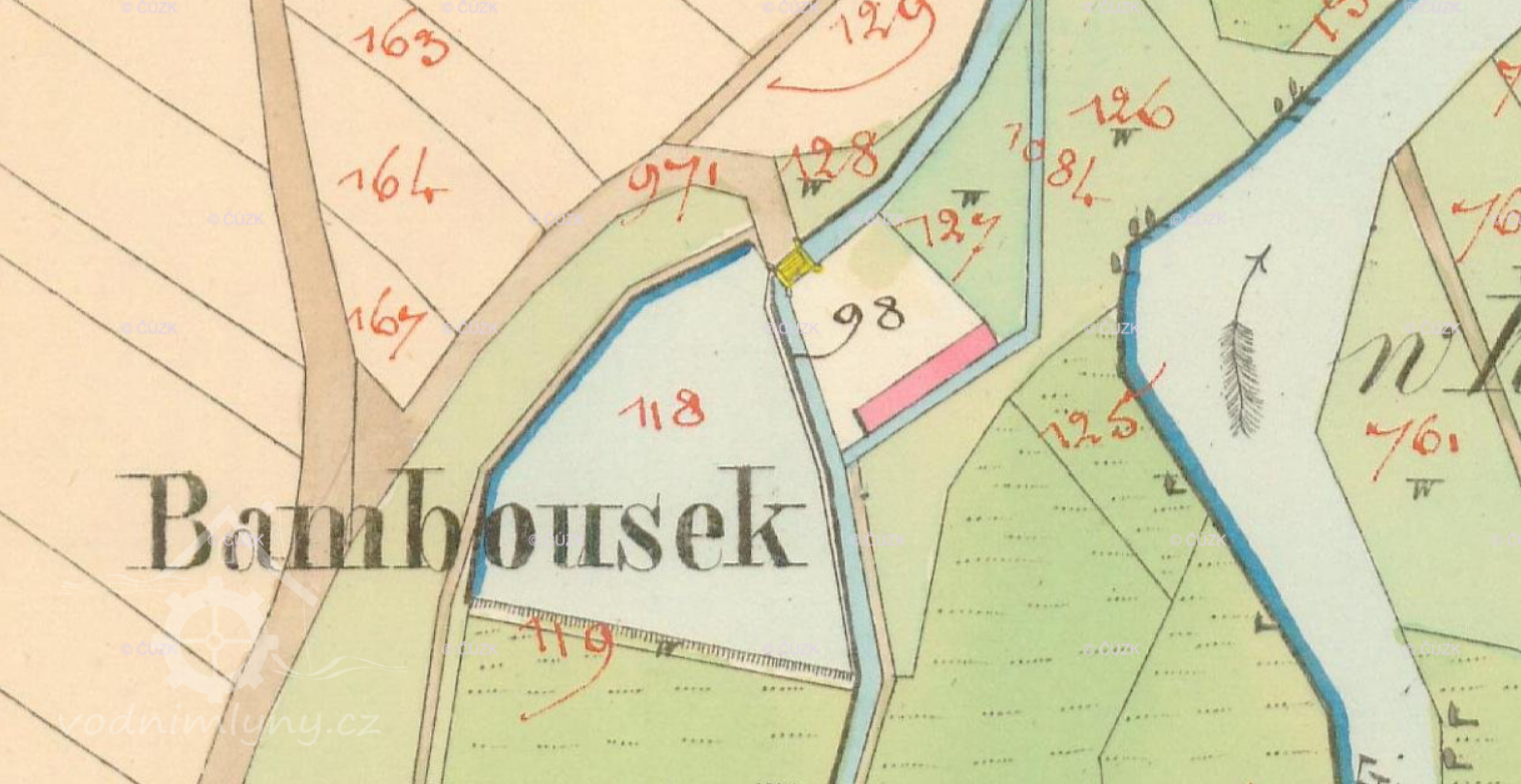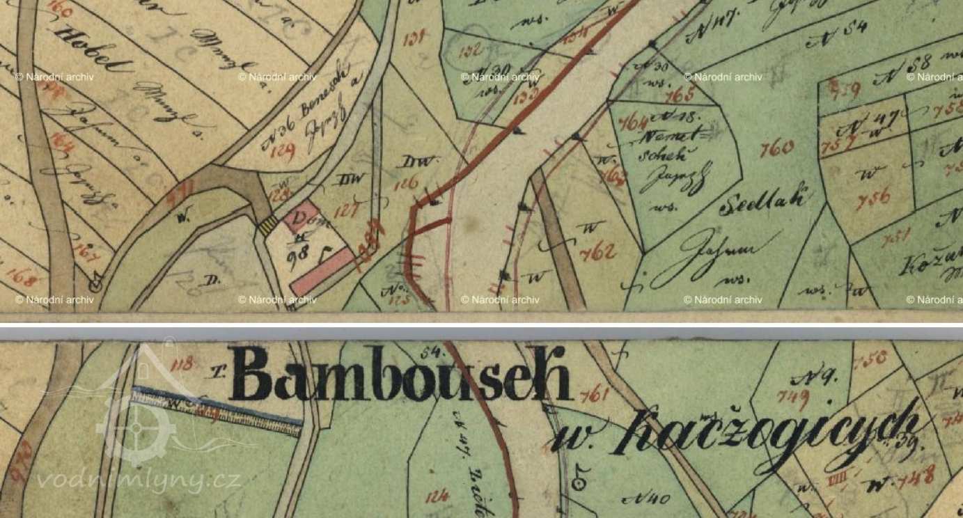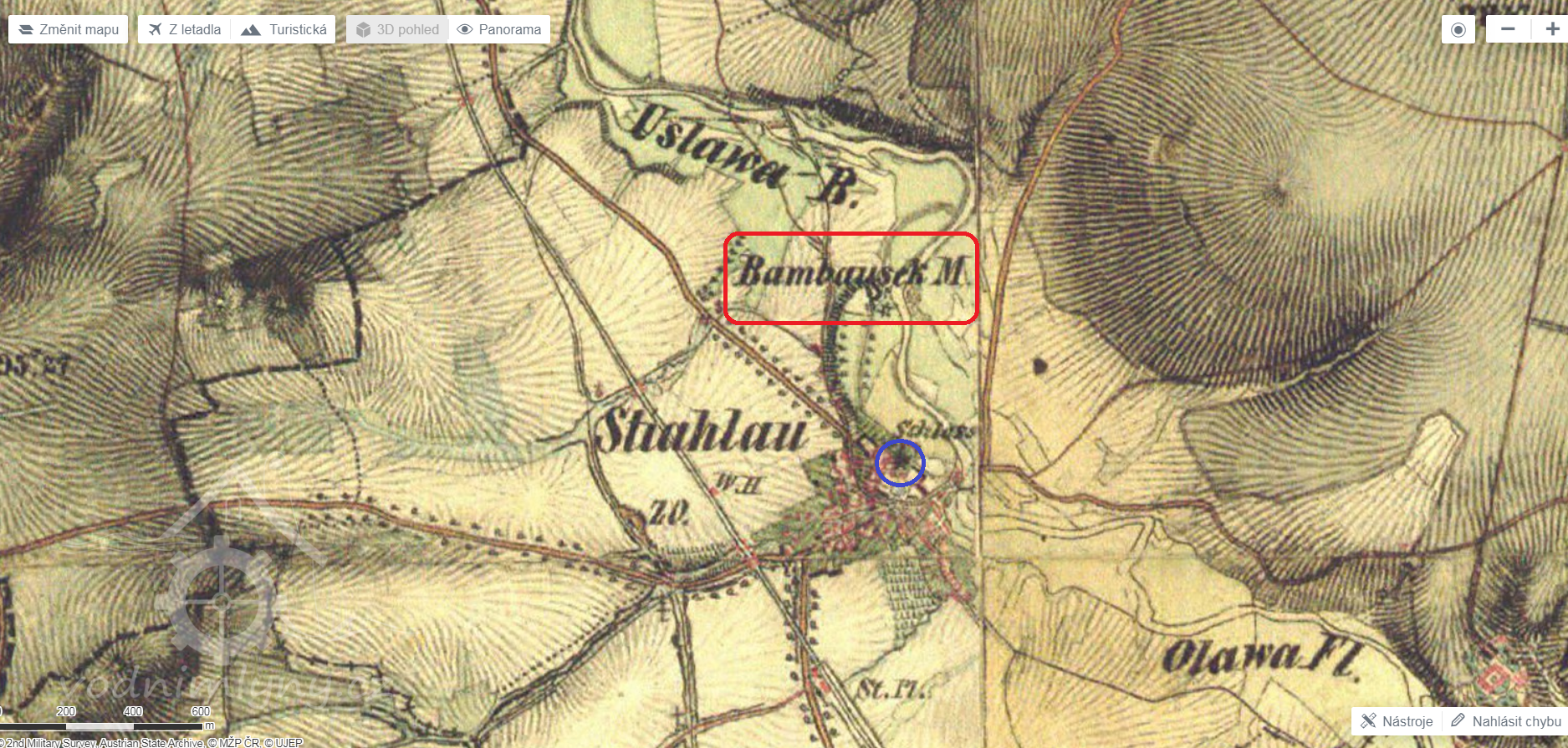 Bambousek (červeně) a Parní mlýn (modře) ve Šťáhlavech, III. vojenské mapování. výřez, 1877-1880, © oldmaps.geolab.cz