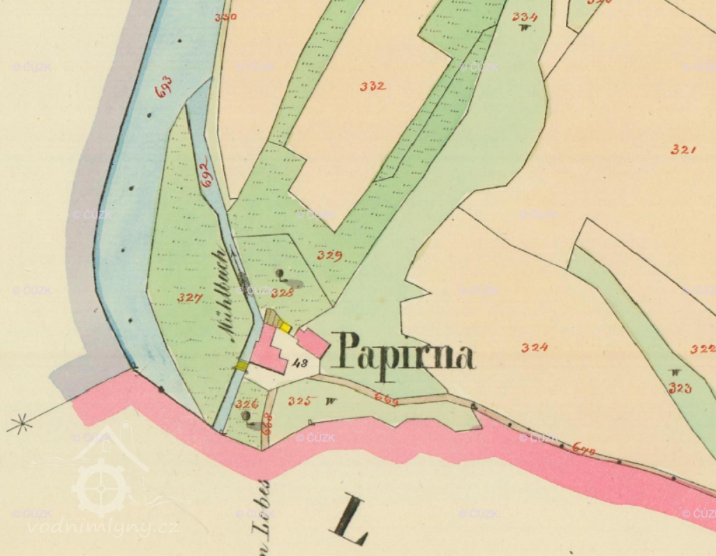 Božkovský (červeně) a Lobezský (modře) mlýn, II. vojenské mapování, výřez, 1836-1852, © mapy.cz
