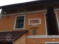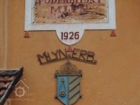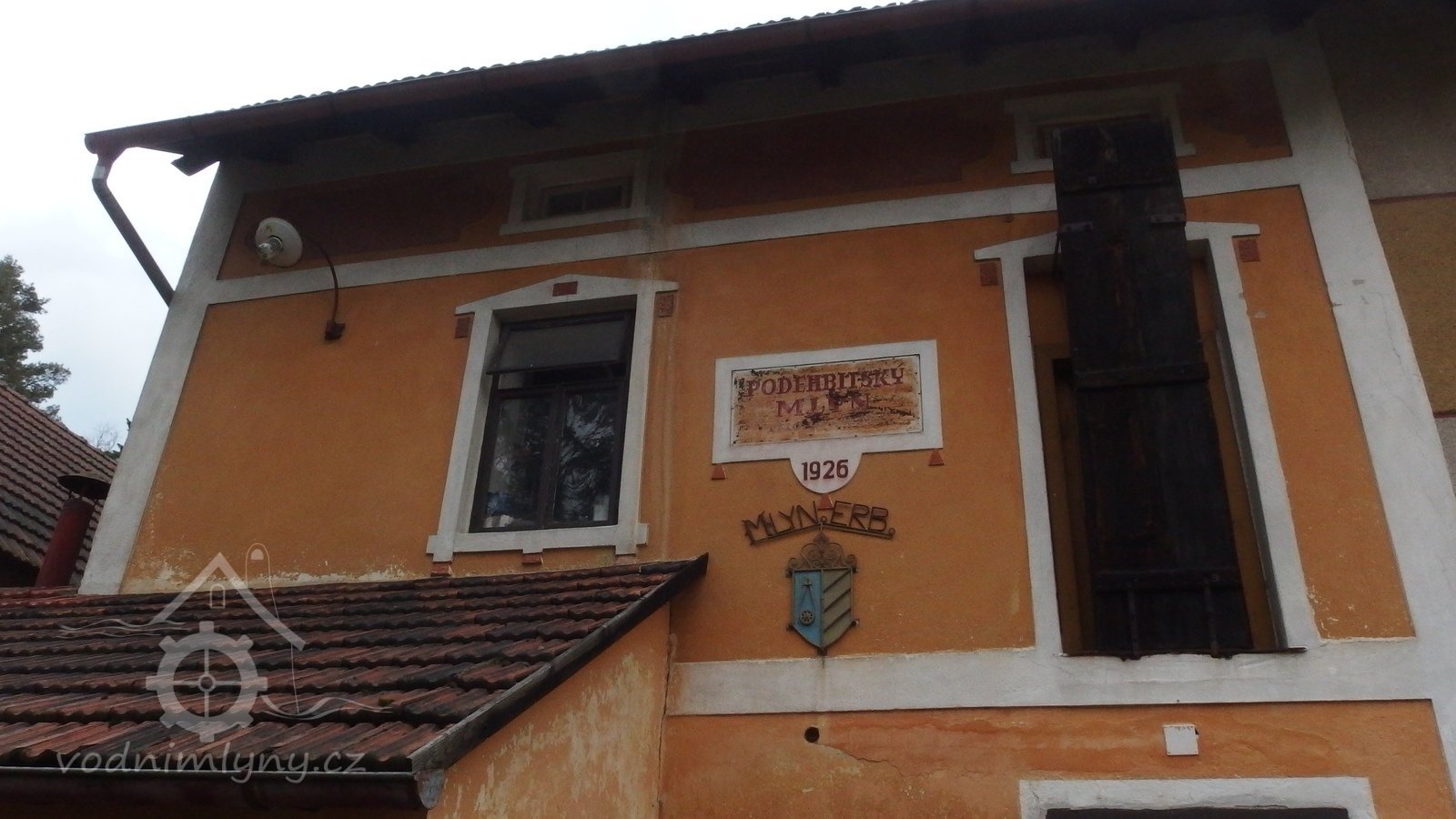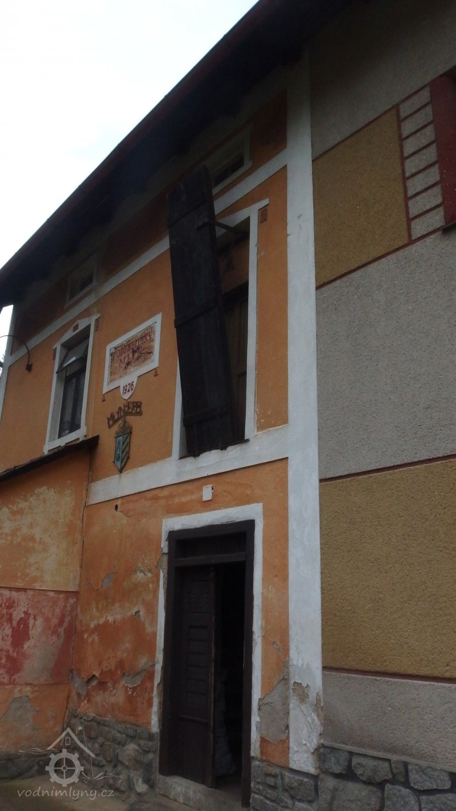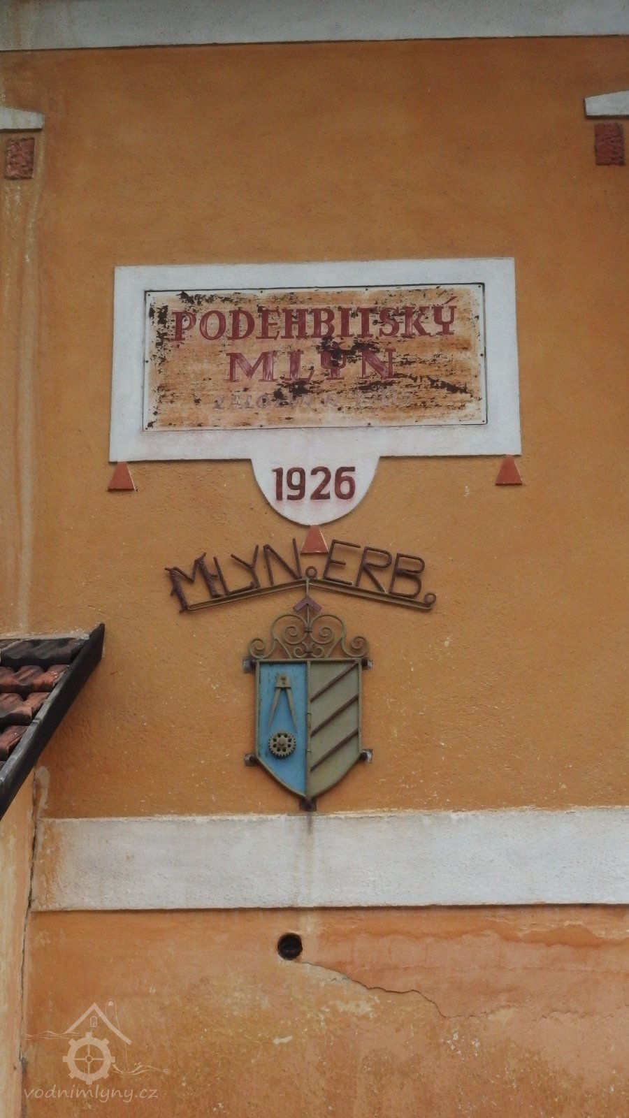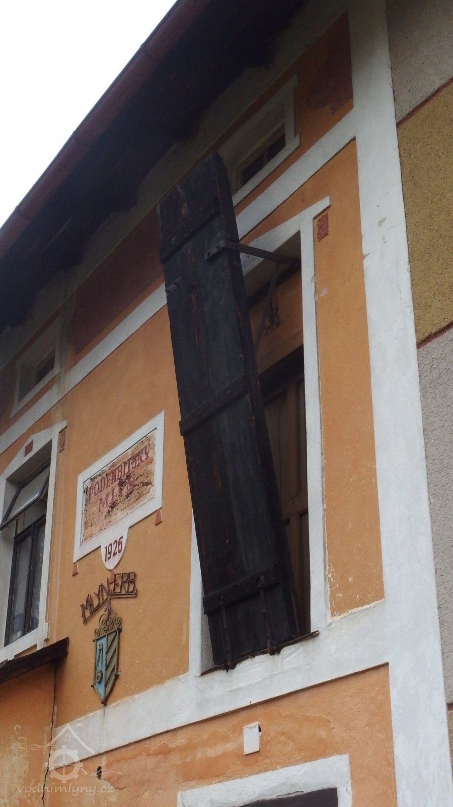 Název mlýna a letopočet 1704 (k nepřečtení) a rok výstavby mlýna zděného 1926, 2016, © Šimek, (Prvky na obrázku: plastická omítková výzdoba fasád a štítů)