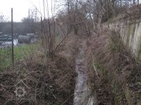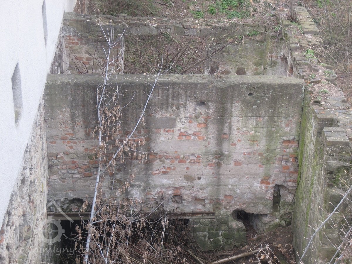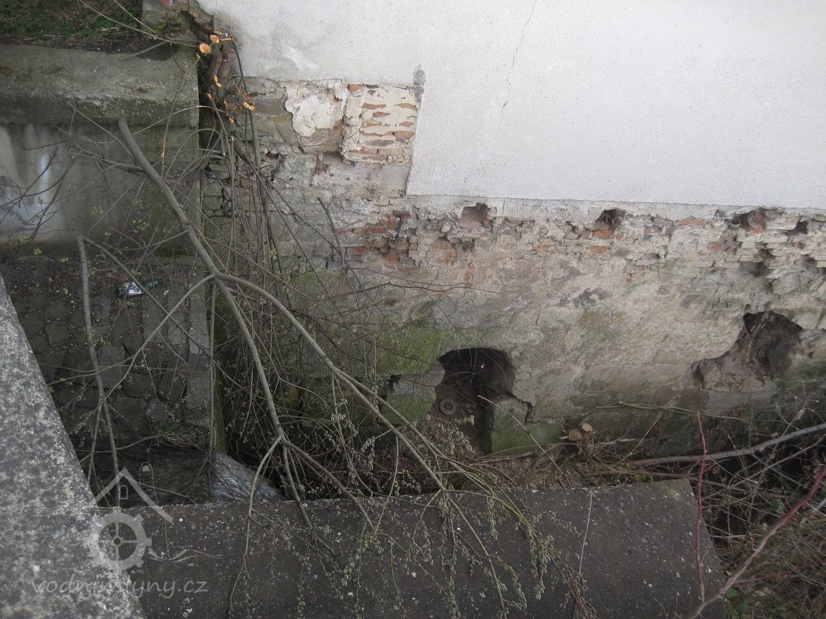 Náhon mezi železniční tratí a mlýnem. Na ortofoto z r. 1953 v těchto místech existovala akumulační nádržka. Dnes v těchto místech křižovatka, betonová opěrná zeď souvisí s výstavbou křižovatky, březen 2016, © Dušan Žatecký