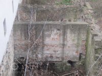 Nově vyzděný přívod vody do lednice. Její zřejmě nejstarší část vyzděna z velkých pískovcových bloků. Otvor v návodní zdi pro průchod hřídele vodního kola, březen 2016, © Dušan Žatecký