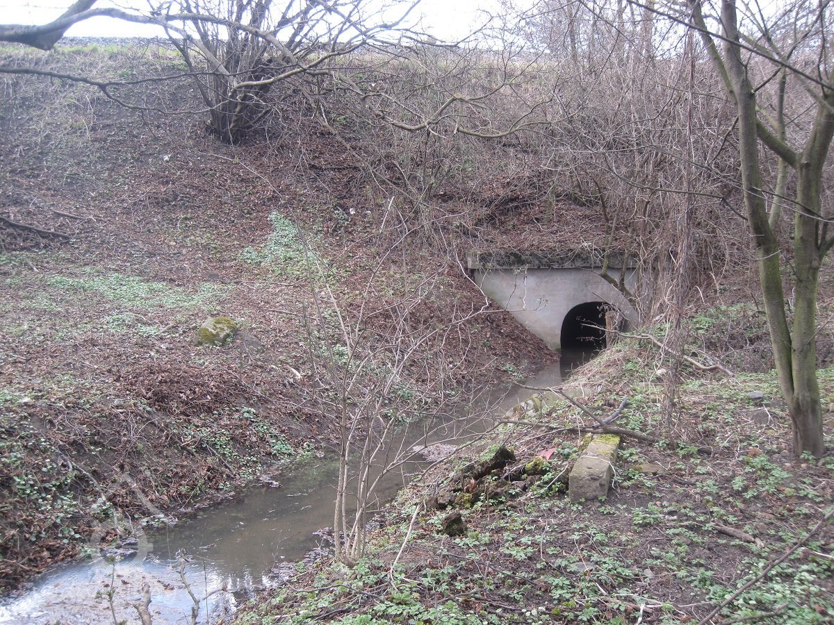Násep železniční tratě vybudované za R-U kříží trasu náhonu - dnešní propustek má vročení 1969, březen 2016, © Dušan Žatecký