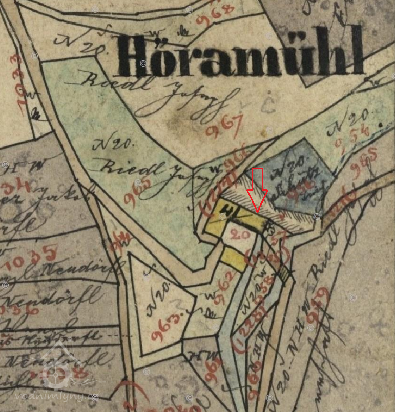 Na indikační skice z roku 1849 je uveden jako majitel čp. 20 Josef Riedl. Mlynařil zde s manželkou Katharinou.