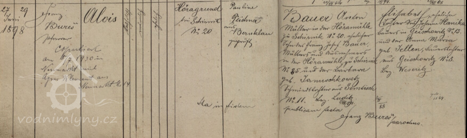 Kolem poloviny 19. století přišel na mlýn mlynářský rod Bauerů, který zde pak hospodařil po dobu přibližně 100 roků. Prvním byl Franz Josef Bauer, který se narodil v roce 1821 na níže položeném mlýně Untere Höramühle čp. 21 jako syn tamního mlynáře Thomase Bauera. Franz Josef měl za manželku Barbaru Januschkowetz, dceru kovářského mistra z obce Semteš u Žlutic. Matriky zaznamenaly narození jejich 5 dětí, synů Antona (1854) a Johanna (1866) a dcer Anny (1852), Franzisky (1860) a Theresie (1863).