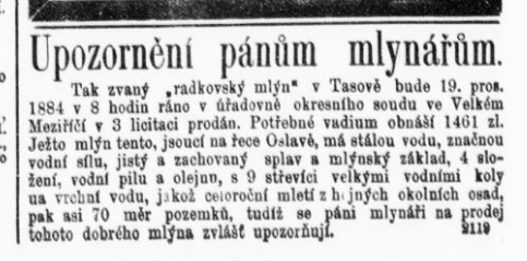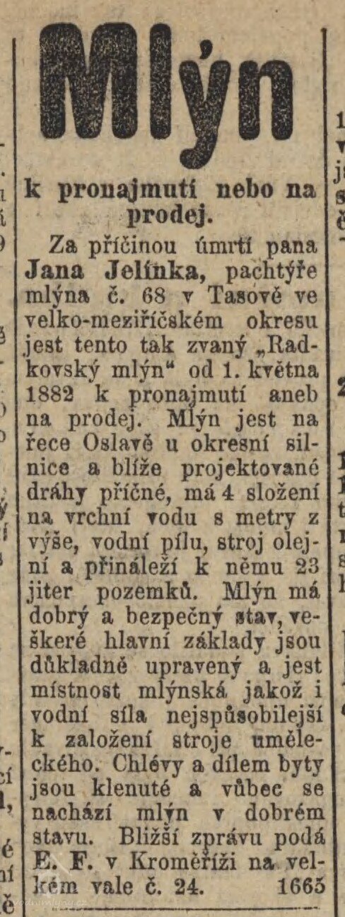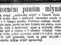 10. 11. 1885 za 9 800 zlatých vydražili Alois a Josefa Stejskalovi z Jelínkova (Panského) mlýna v Tasově č. 66.