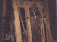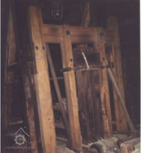 Má dřevěný rám šikmo po řezu postavený, na přední straně bez horního úchytného válce, který je nahrazen opěrnou tyčí, připevněnou na dřevěné konstrukci pily. Uprostřed rámu je dřevěná vložka pro uchycení pil. Tím se zmenšila světlost na cca 70 cm.