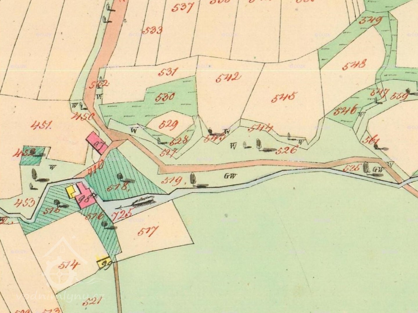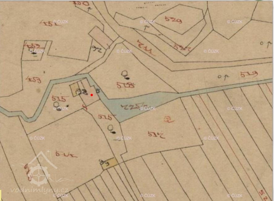 Nad mlýnem stav a rybníček, břehy dosud znatelné.