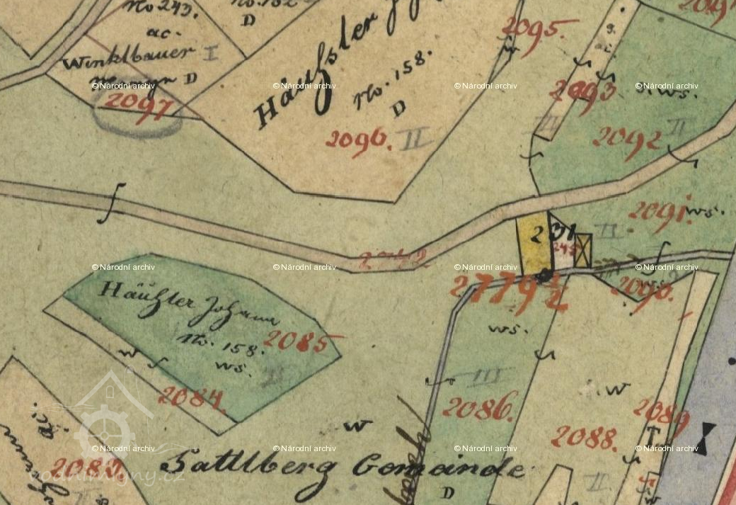 Josef Haslinger, narozený v roce 1814 v Zelené Hoře, se ještě jako bydlící v rodné usedlosti (později sedlák a mistr mlynářský v Sattelberg/Thalhäuser-Brückmühle, syn Franze Haslingera, svobod.králov.sedláka z Dol.Zel.Hory čp.81 /později nové čp.148/ a Magdaleny roz.Winkelbauer z Hor.Hrádků čp.133 "Simandlbauer" /poz.nové čp.85/), oženil v roce 1838 v Srní s Marií roz.Gruber 1817 ve Starém Srní (dcerou Johanna Grubera, svobod.králov.sedláka ze Starého Srní čp.102 a Elisabeth roz.Klostermann z Dol.Hrádků čp.126 /poz.nové čp.95/. Tato Elisabeth byla tetou pedagoga a známého spisovatele Karla Faustina Klostermanna). Jejich děti narozené ve mlýně: Florian 1852, Anton 1858 (jeho kmotrem při křtu byl Karl Gruber, mistr mlynářský ze St.Srní čp.241 "Lochmühle").