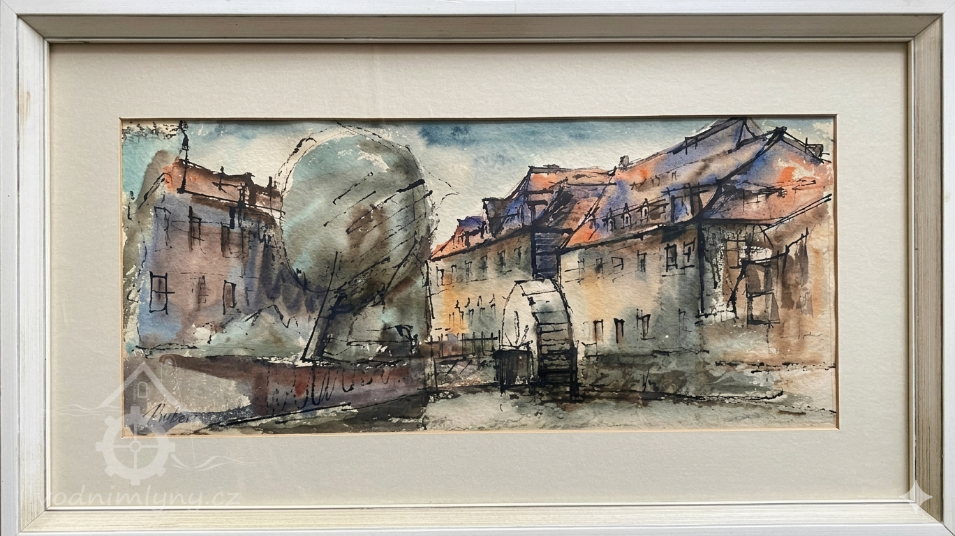 Pohled na mlýn, grafika, celkové rozměry 43,5x36,5 cm, nedatováno, © Bauer