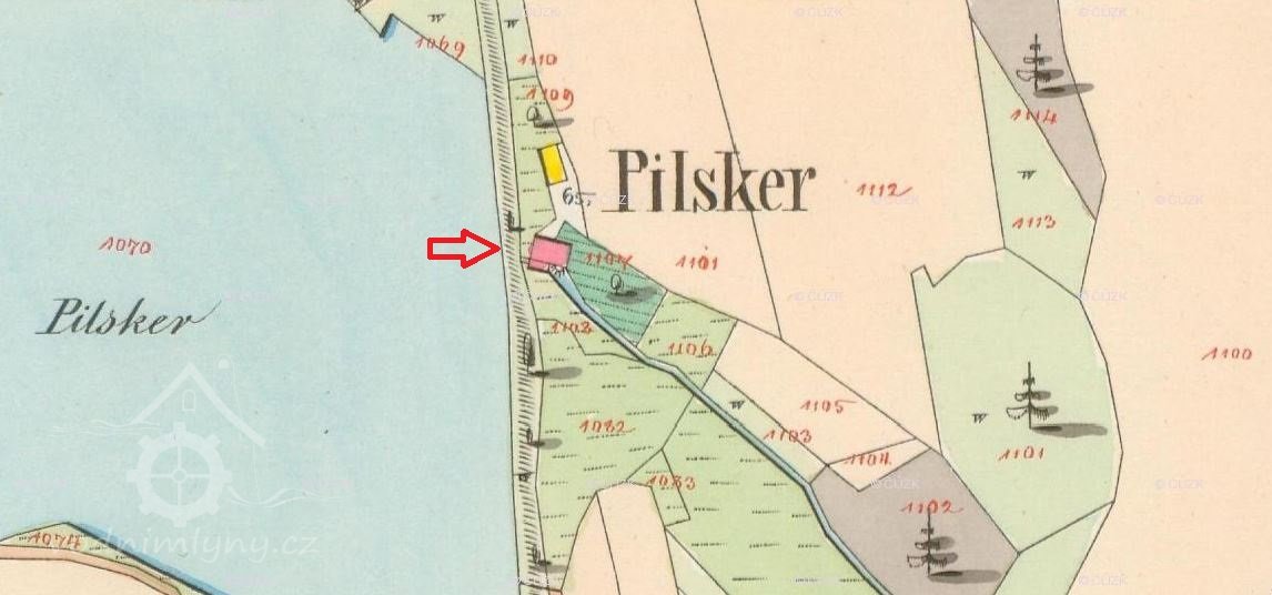 Zachovalá budova na břehu rybníka Pilsker/Pilka u Pičína.