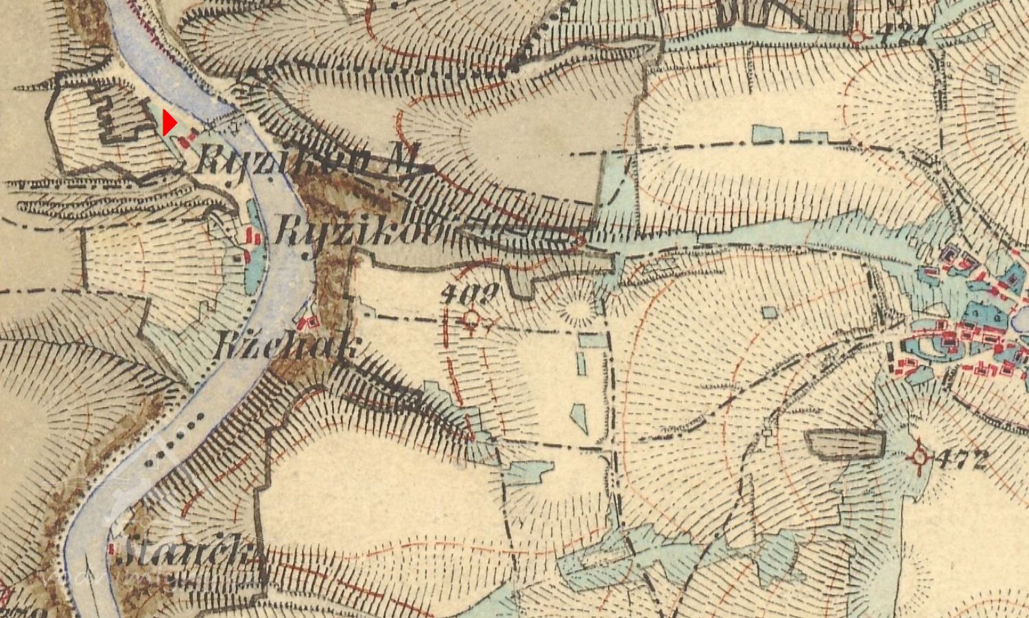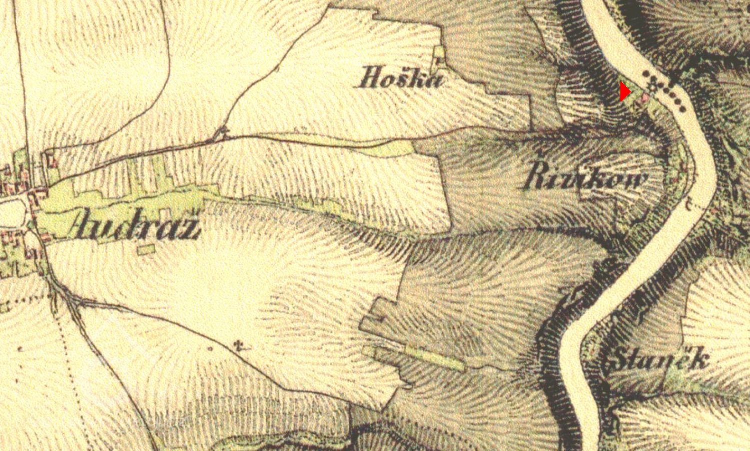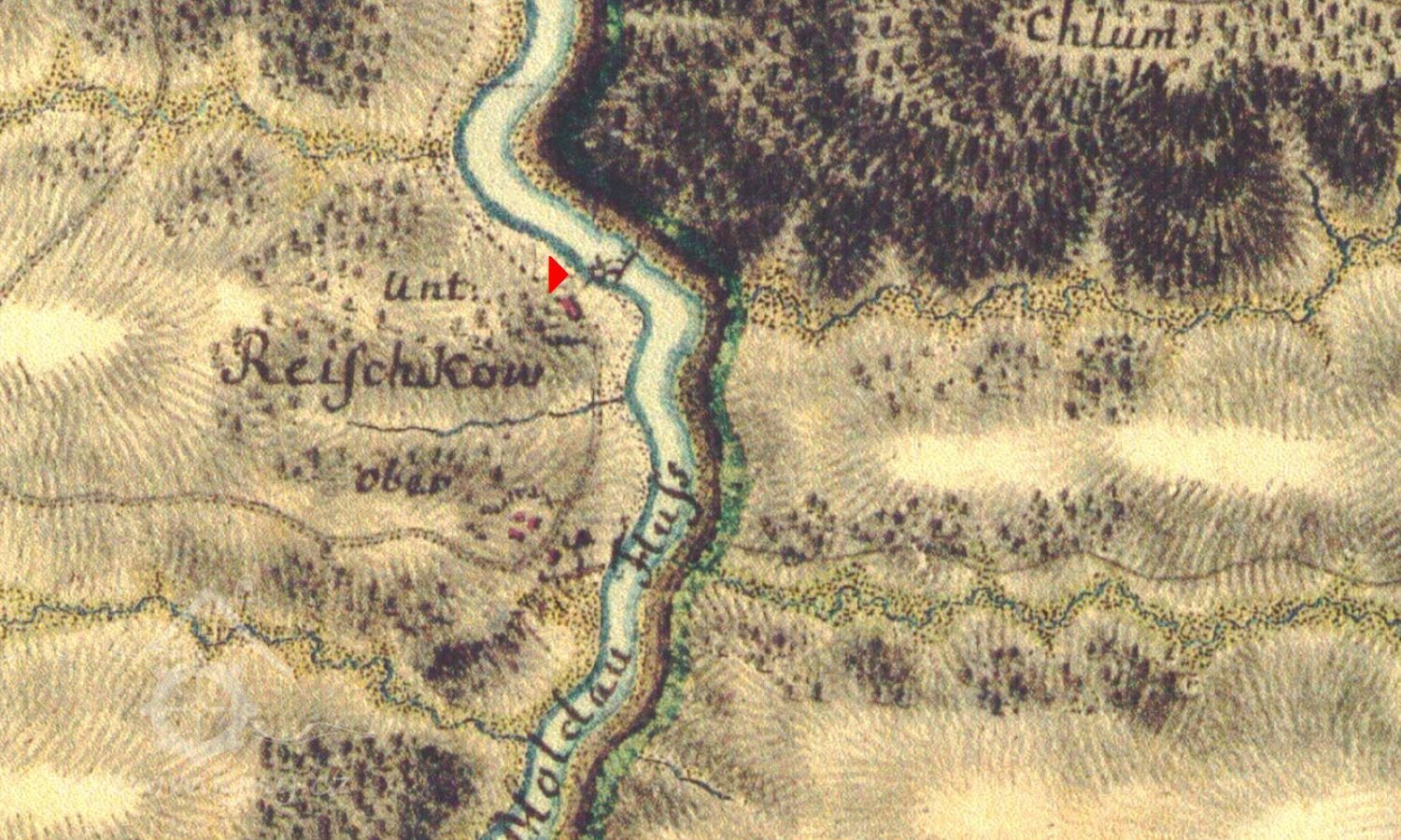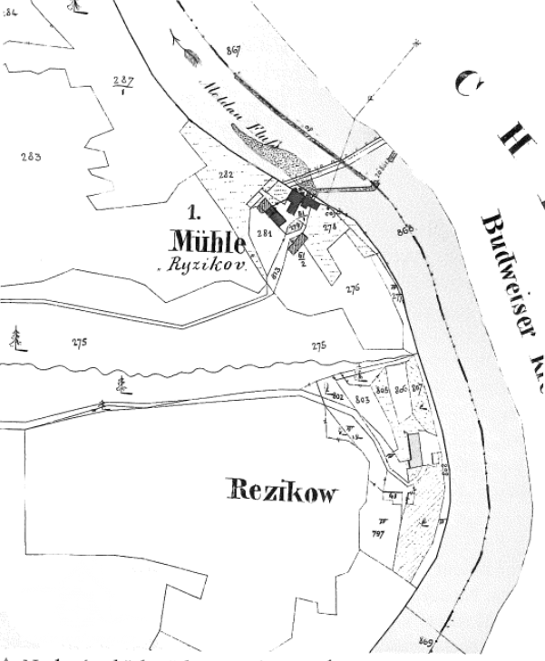 Asi půl hodiny východně od vsi Údraže v hlubokém, lesnatém údolí řeky Vltavy - na levém břehu řeky - leží samota Rejsikov nebo Rysikov. Pod lesnatou strání už v dávných dobách byl mlýn a několik set kroků proti proudu řeky, trochu výše na úpatí stráně hospoda (není uvedena v berní roli r. 1654). Hospoda i mlýn byly majetkem vrchností. Mlýn patřil k statku neznášovskému, hospoda ke statku chřešťovickému.