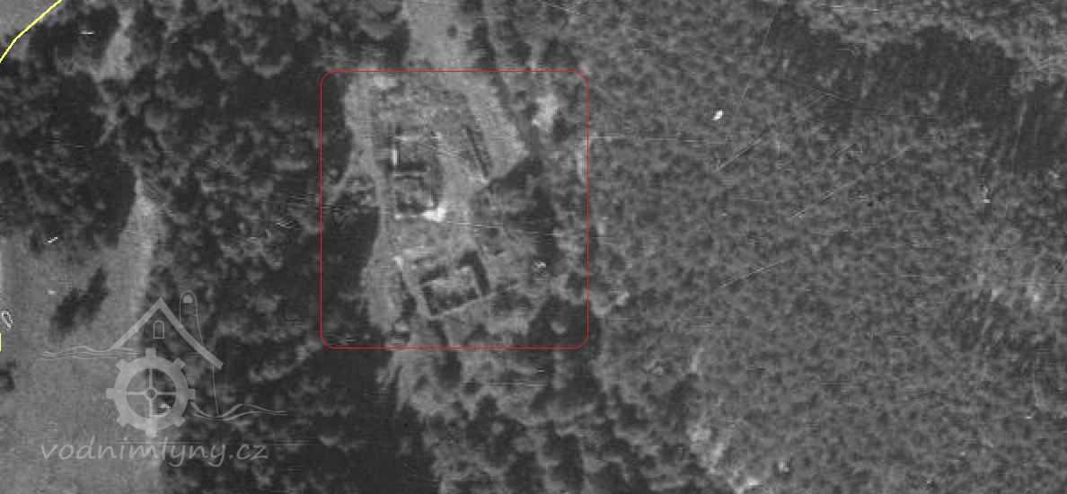 na jižním okraji areálu objekt (patrně stodola), jehož středem procházel náhon, zanikl dříve než vlastní mlýn