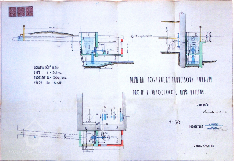 1930 - 1 kolo na vrchní vodu, hltnost 0,087 m3/s, spád 3,72 (3,417) m, výkon 3 HP, prům. 3,24 m, šířka mezi věnci 1,5 m, 8 ot/min