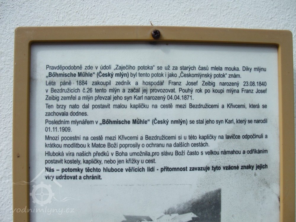 V roce 1930 byl majitelem objektu Karel Zeibig, vodní motor poháněl hospodářské stroje. Potok se nazýval Hasselbach.