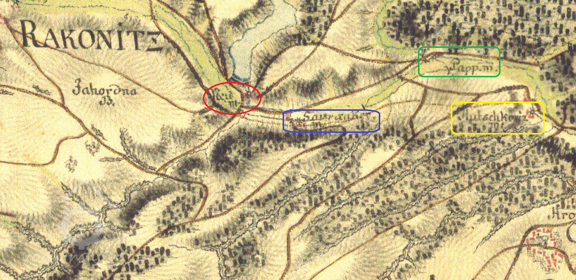 k mlýnu náleží 25 jiter dědin, 3 mlýně, 3 na Hané a 19 k Hostokryjím, z těch všech platí plat do Rakovníka