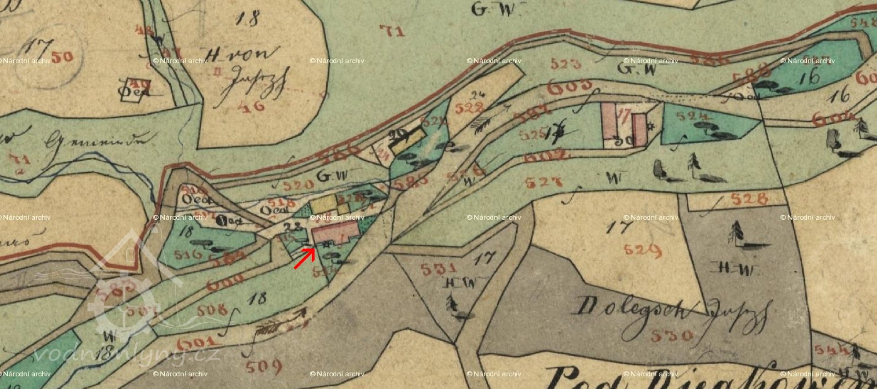 1610 Urbář křížovnický: Vít, hořejší mlynář, hospodaří ve mlýně o 1 moučném kole, má povinnost dávat vrchnosti o lovu 1 pecen chleba a 1 věrtel tluče.