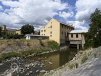 První a druha budova vodní elektrárny propojena spojovací budovou umístěnou nad vodním náhonem.