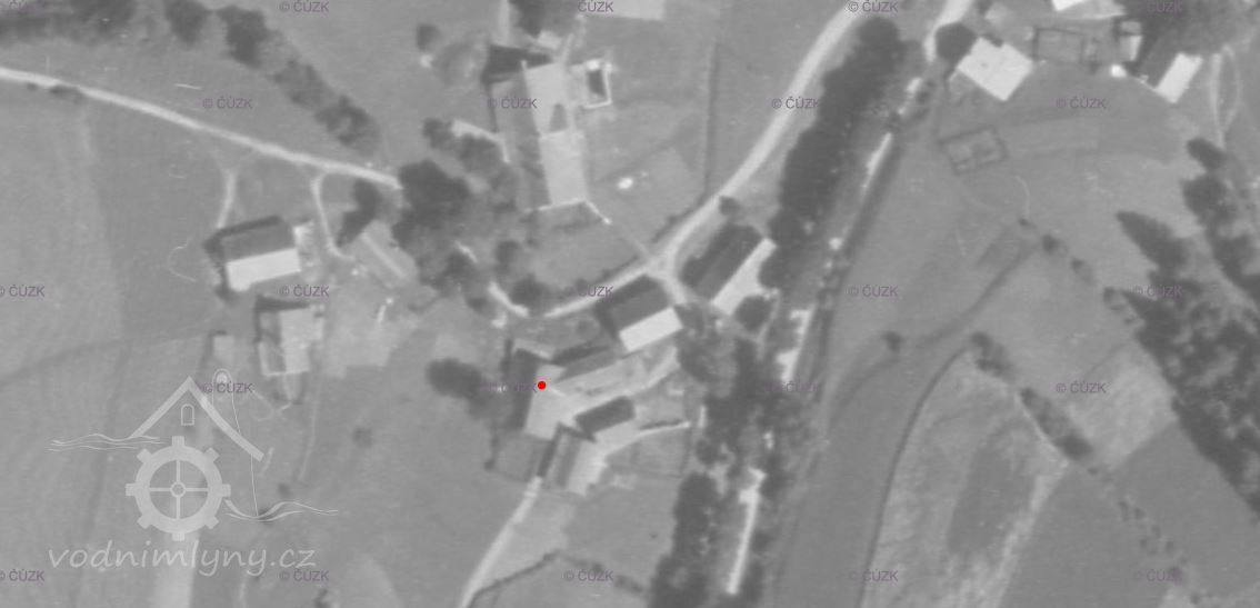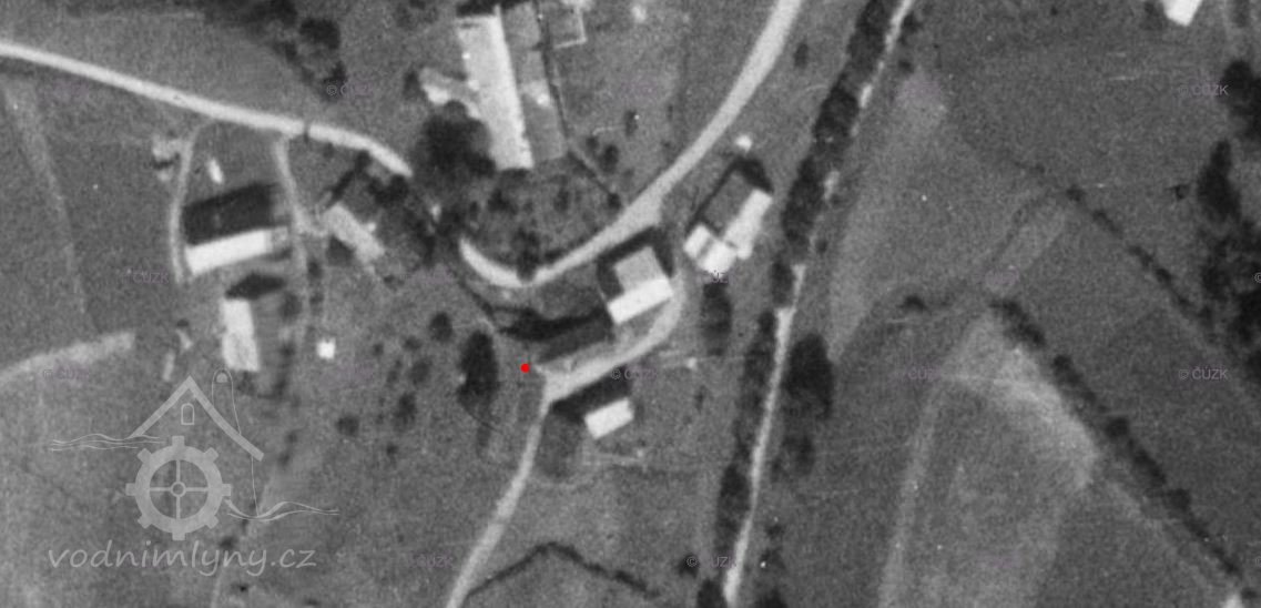 Pohled na přestavěnou obytnou část mlýna, pohled od jihu. V místě smrku stála mlýnice. Náhon, který byl nalevo od smrku, je zasypán., 09 2017, © mapy.cz