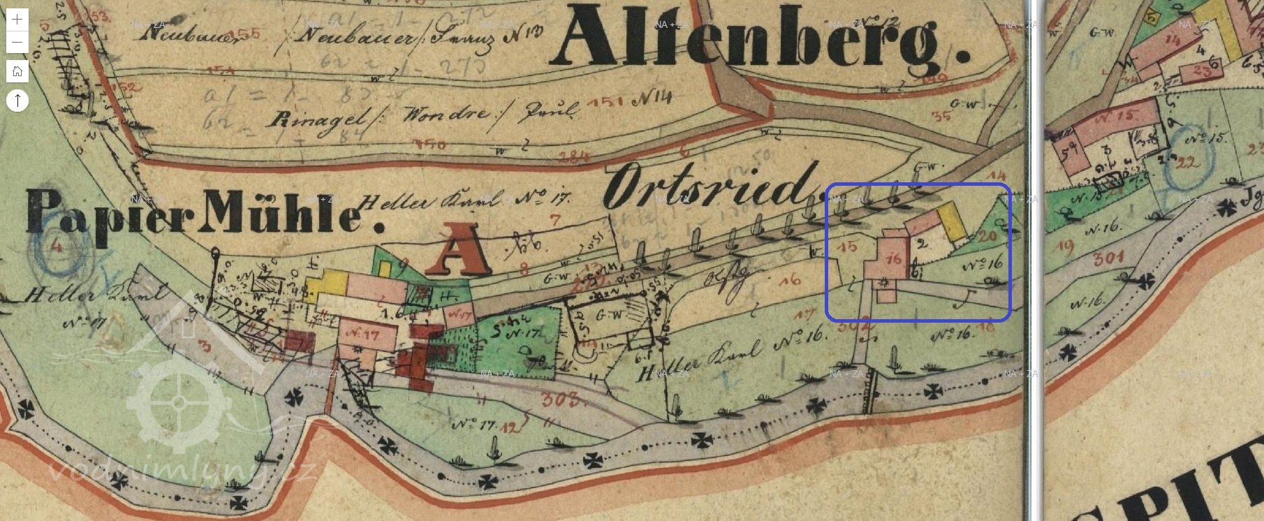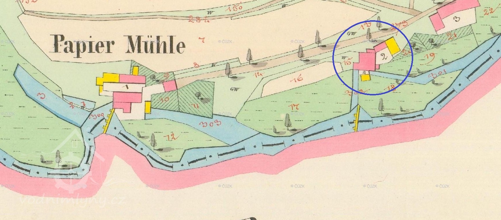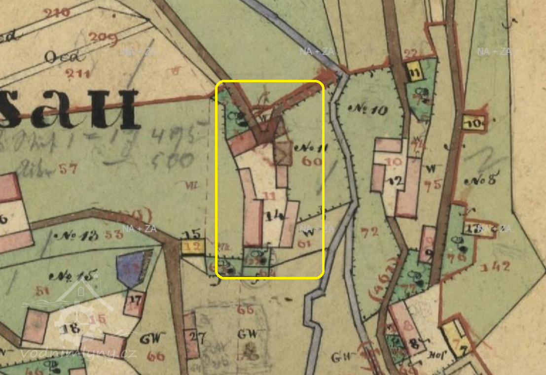 Vodopisná mapa mlýna, 1875, © SOkA Příbram, OÍ Sedlčany, inv.č. 29, Sb. listin a plánů k vodní knize č. 20