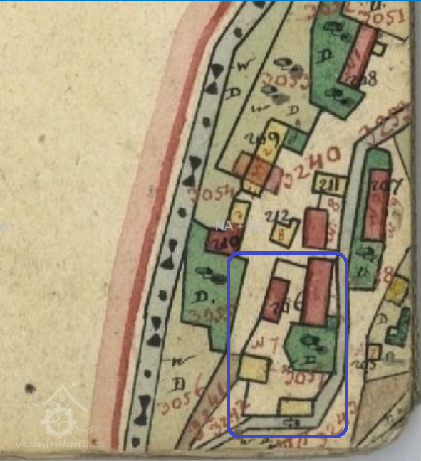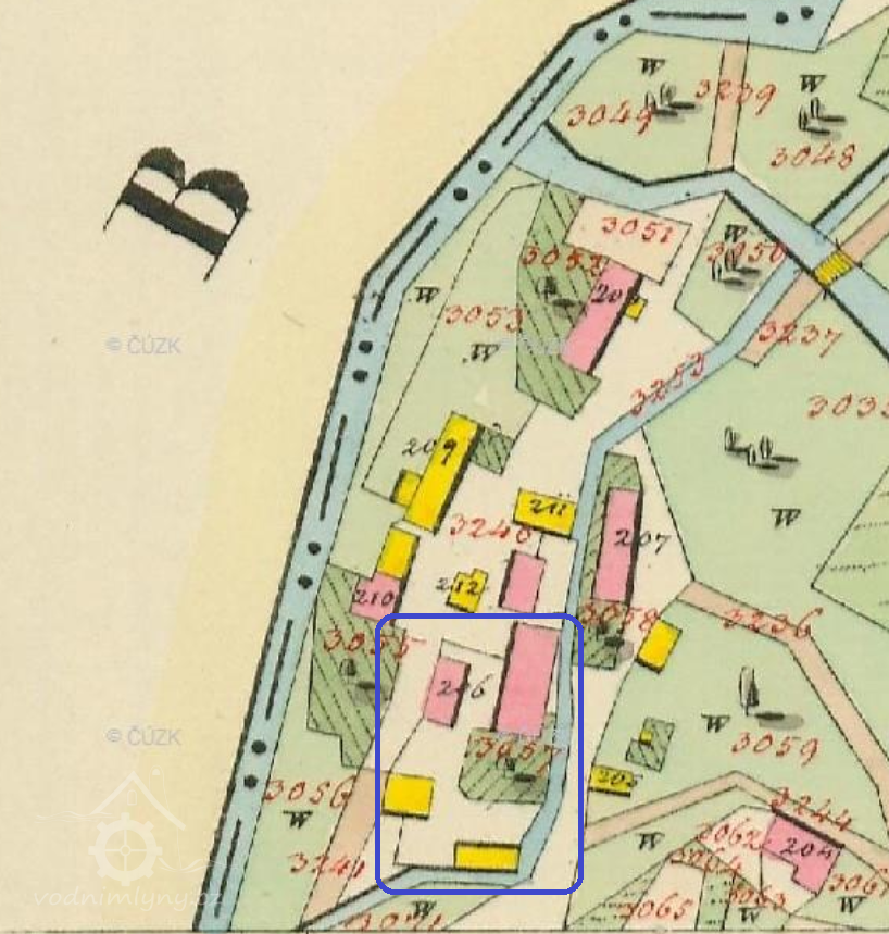 Vodopisná mapa mlýna, 1895, © SOkA Příbram, OÚ Sedlčany, inv.č. 10, Sb. listin a plánů k vodní knize č. 1