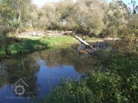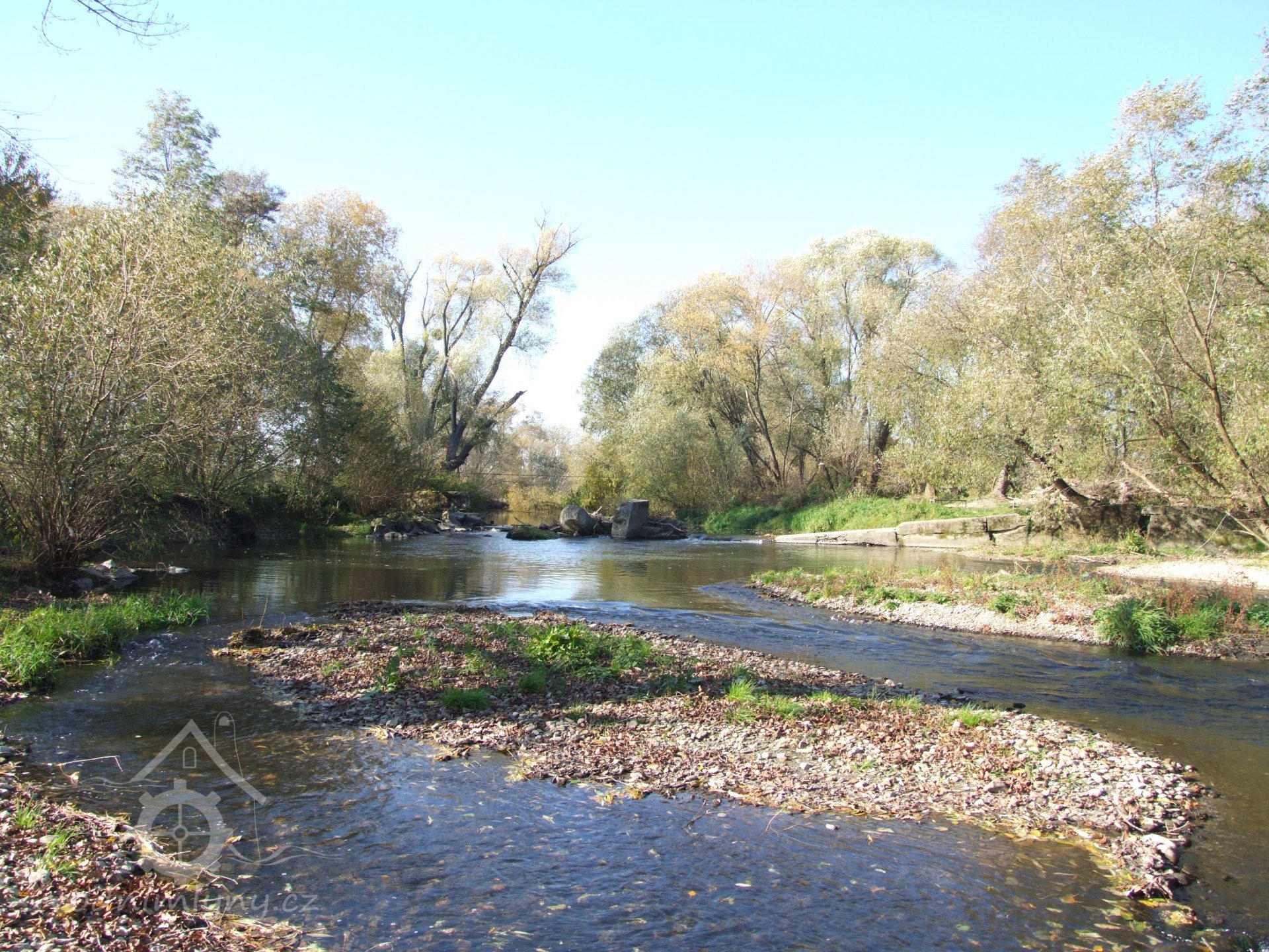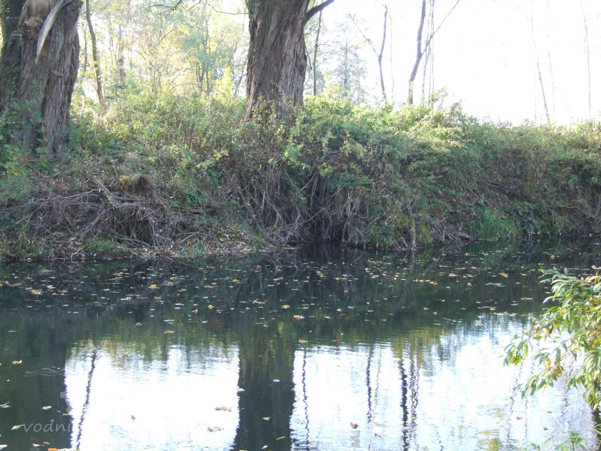 Červený mlýn č.p. 73, Holasovice – vodní právo: 'jalový odpad', spíše vracečka, již dnes vůbec neexistuje a trasu možno poznat jen dle historických specializovaných vodohospodářských map a pak v terénu podle nich jít a neuhnout. Koryto bylo uprostřed fotografie (fotografováno po vodě), říjen 2021, © Jiří Hořák, (Prvky na obrázku: náhon)