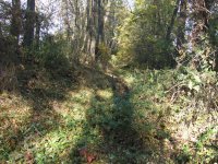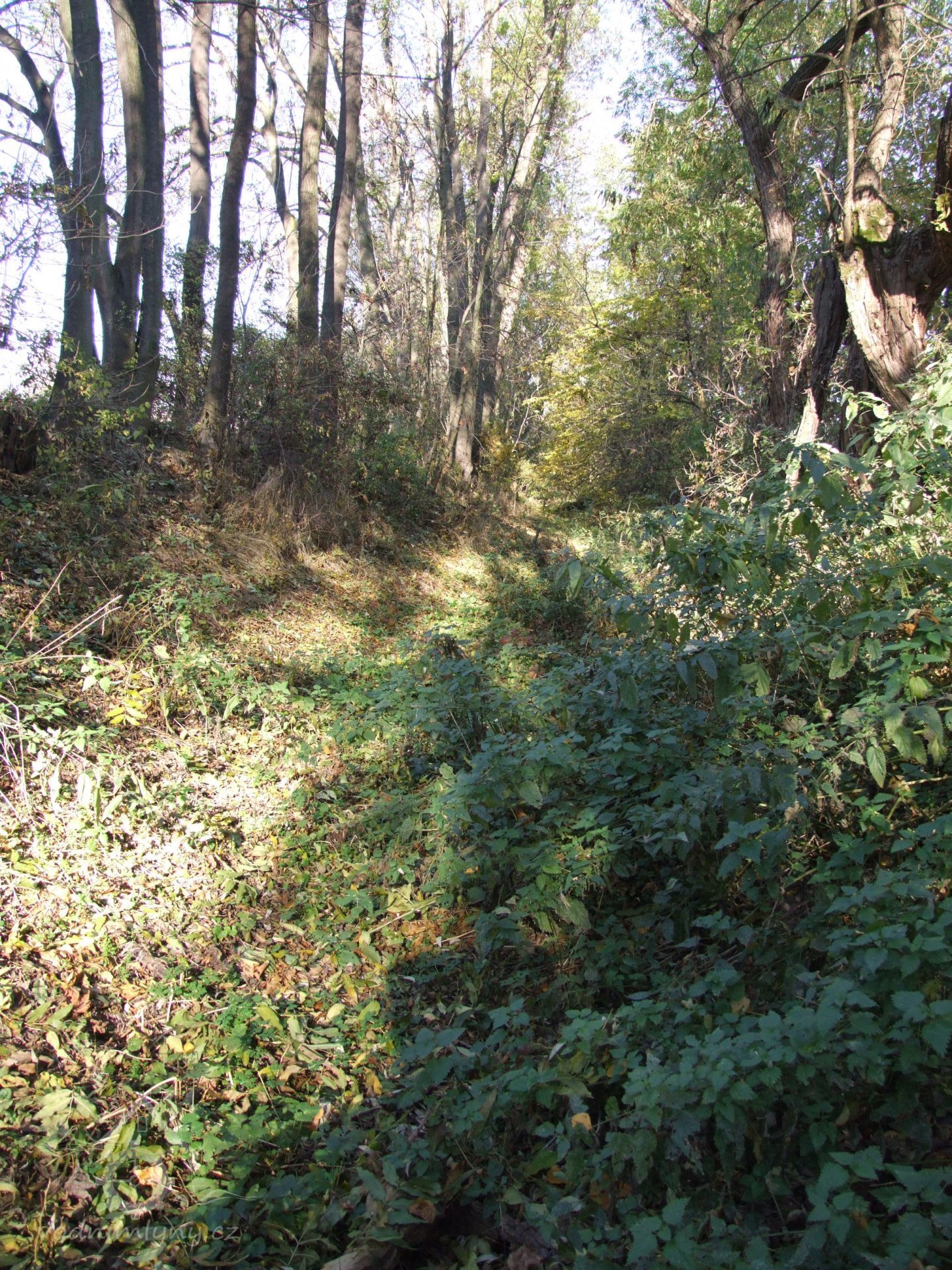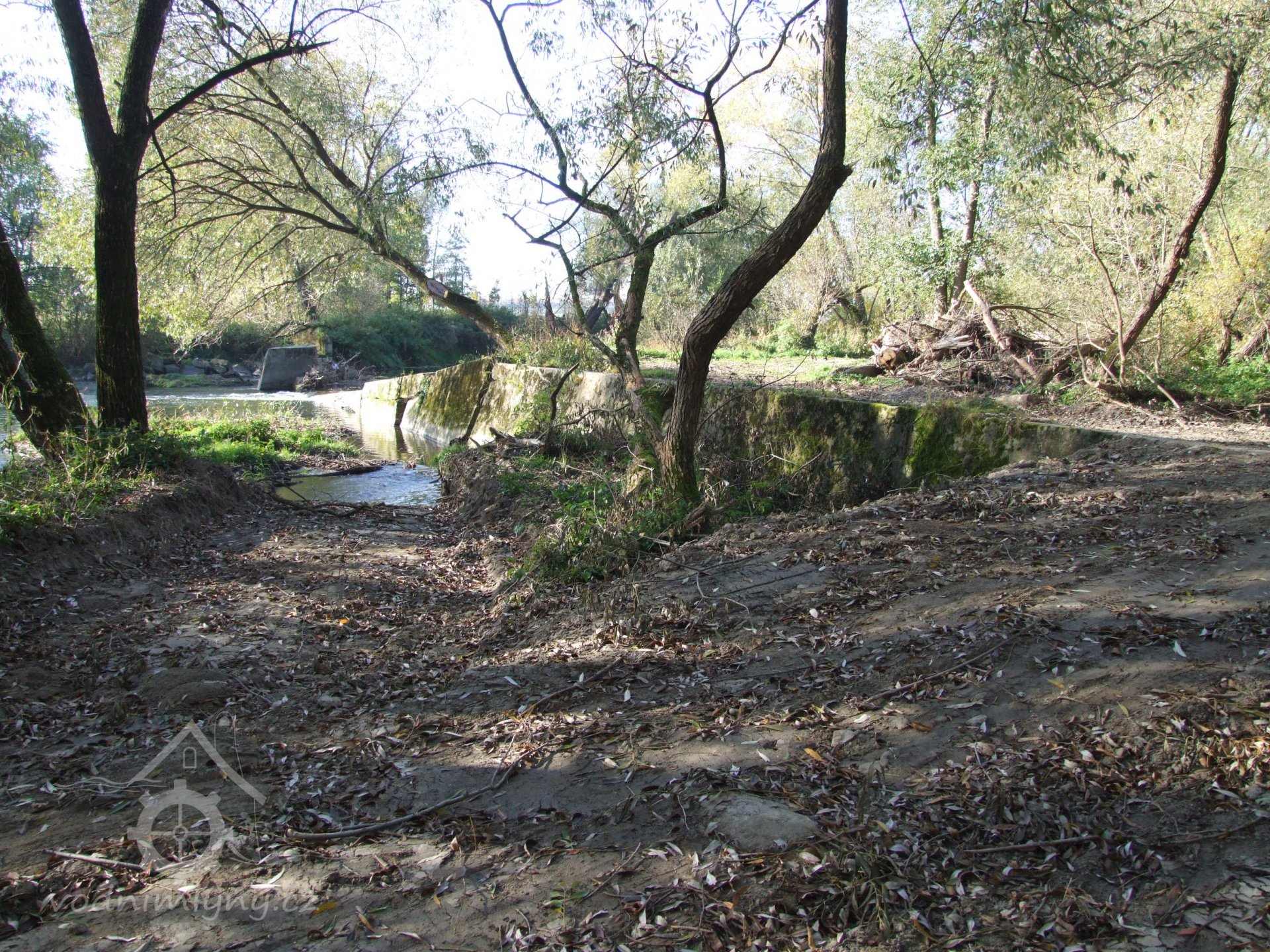 Červený mlýn č.p. 73, Holasovice – vodní právo: horní mlýnská strouha za Červeným mlýnem (voda protékala zleva doprava), říjen 2021, © Jiří Hořák, (Prvky na obrázku: náhon)